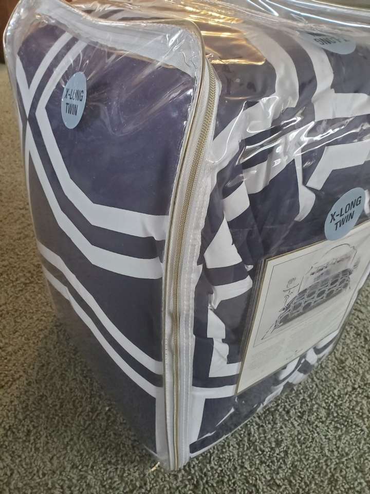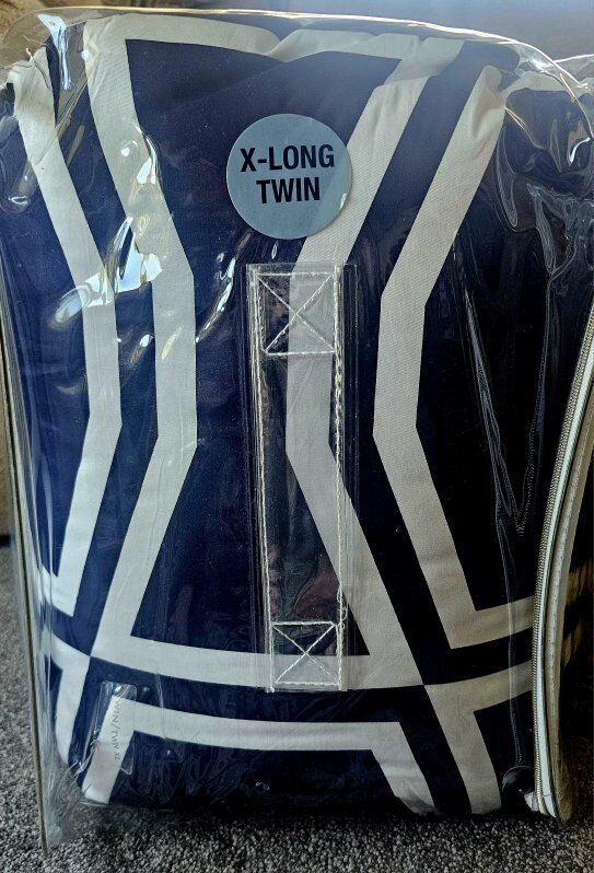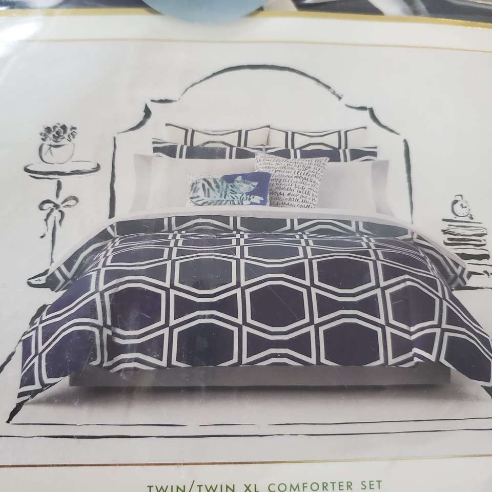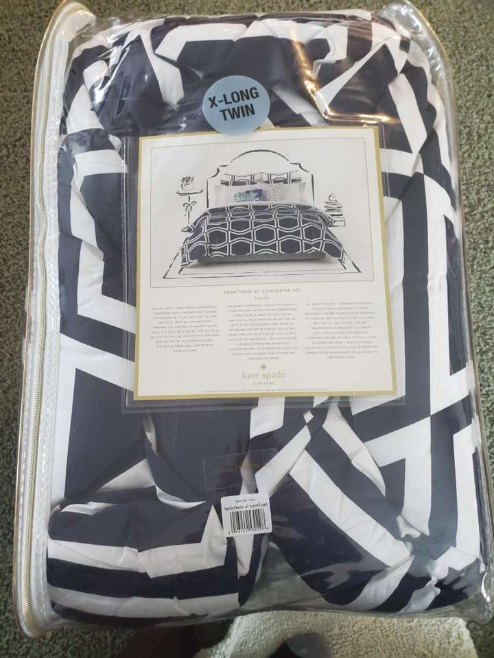 This is a QUALITY KATE SPADE! It's a fluffy, warm comforter -- NEW, & NEVER BEEN opened!! This was bought for the kids beds at College - which are typically EXTRA long to accommodate DORM beds and can be folded back at the pillows or put over the pillows. This is BRAND NEW!! in original package, ready to go!!. Pretty, dark NAVY blue/white & Includes pillow sham.