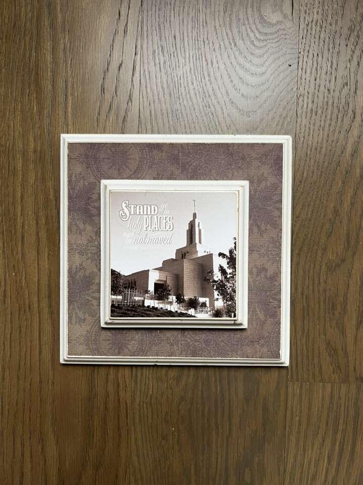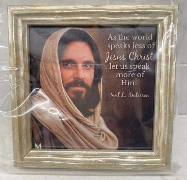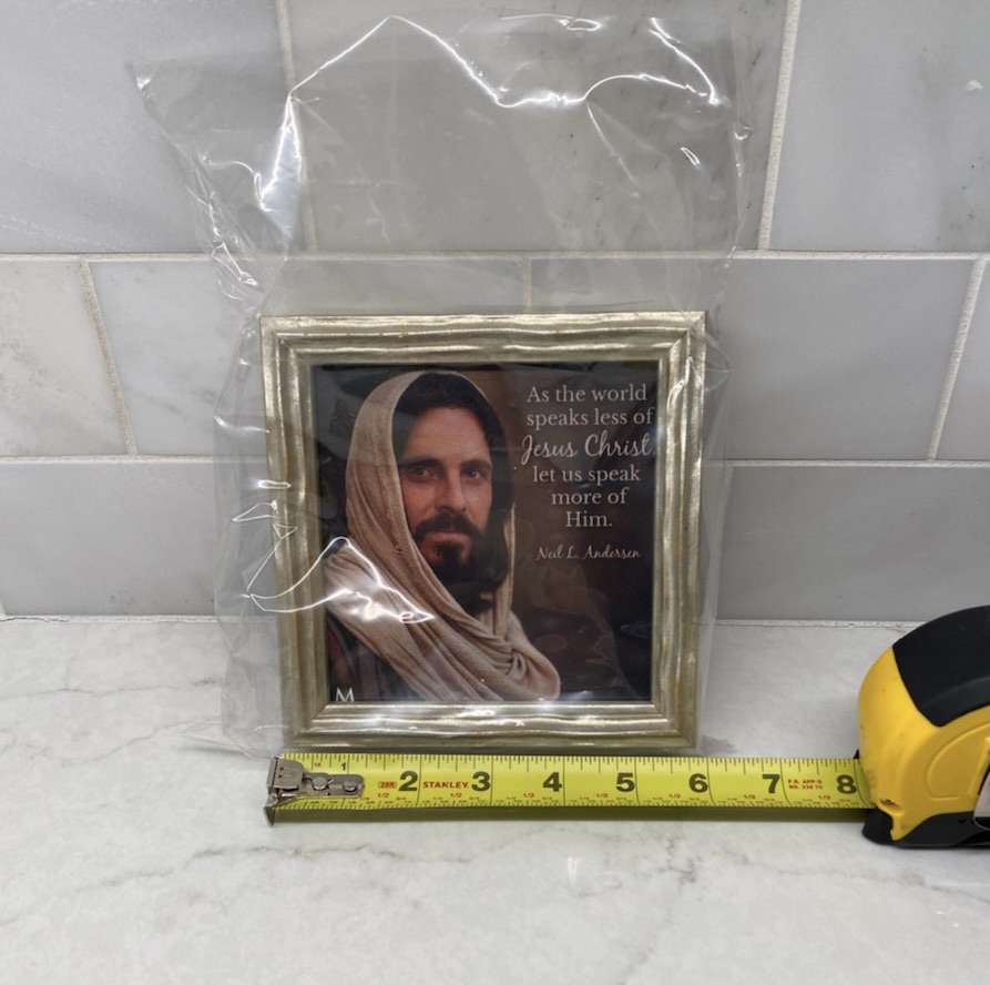 • New-in-box, never-used framed 6x6-inch picture of Christ with the quote “As the world speaks less of Jesus Christ, let us speak more of Him. Neil L Anderson” in original plastic sleeve inside original box, $3