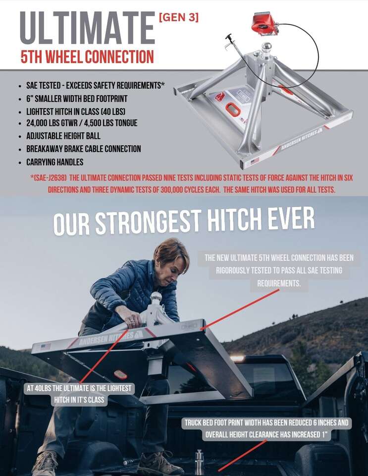 Brand New Andersen Ultimate 5th Wheel Connection, 3rd generation! Includes: Aluminum Base gooseneck model #3220 (24,000 lbs GTWR) and Kingping Coupler with Ball-Funnel. Use coupon code HITCHIT at hitchstop.com for $50 off! Text/call (385) 209-4309 for more info. We are an authorized Andersen dealer. Go to http://www.hitchstop.com/installation-manuals.html to watch a video and see how easy this is to install! ALSO AVAILABLE: Andersen Ultimate Rail Mount version (#3200, 24k GTWR), Andersen Ultimate Toolbox version (#3220-TBX, 24k GTWR), Flatbed version (#3221, 20k GTWR) text or call for more info. Connects to any standard gooseneck ball. The smoothest, quietest, lightest and strongest 5th wheel hitch in the world, and only weighs 35 lbs!! No more "galloping" or "chucking"! We have the best customer service around! Send us a text or give us a call. orders@hitchstop.com
