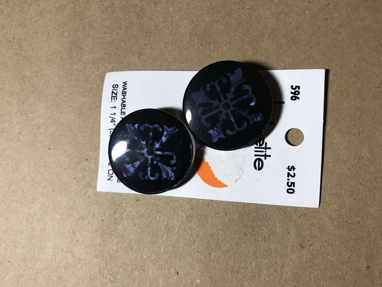 La petite Buttons 2 - 1 1/4” Navy Blue with a design in center. These would be beautful on a sweater or a skirt. Also included is 1 Nicole Zipper Pull. All are new. $5.00