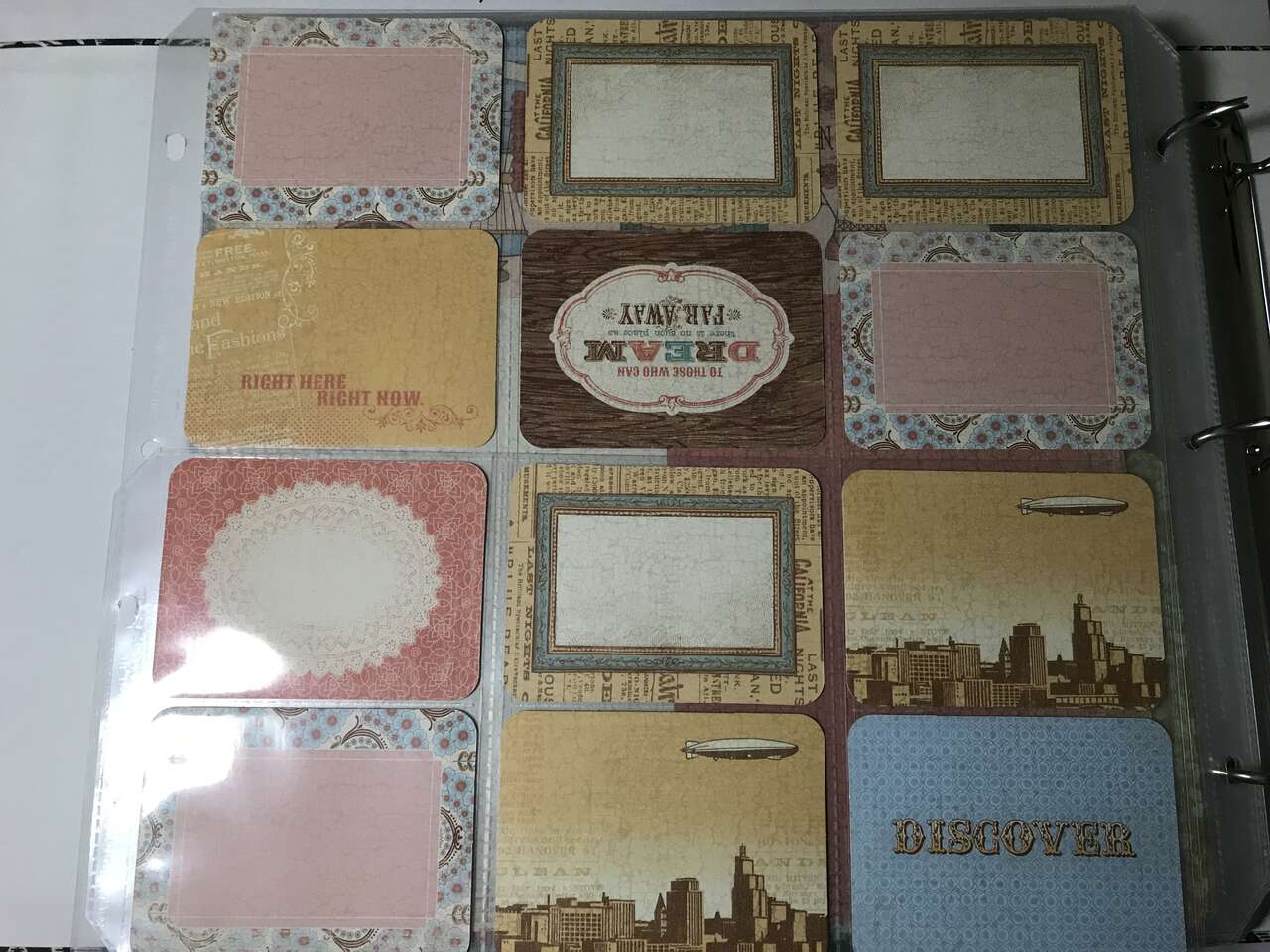 Close To My Heart Cocoa Damask D Ring Binder with 45 Protective Sleeves Filled with Picture My Life Cards. This holds 12" x 12" scrapbooking protective sleeves. The 3 ring binder original price is $45.00. This contains 22 - 12" x 12" top load protector sleeves with original price $15.00 for 10. Also 24 - 12" x 12" protective sleeves each having 3 verticle 6"x4" pockets and 6 horizontal 3" x 4" pockets. These are orignally $15.00 for 10 also. Each of these sleeves are filled with different Picture My Life Cards and Cardstock. If you want more pictures please let me know. All of the items in this listing are new. The original cost over $150.