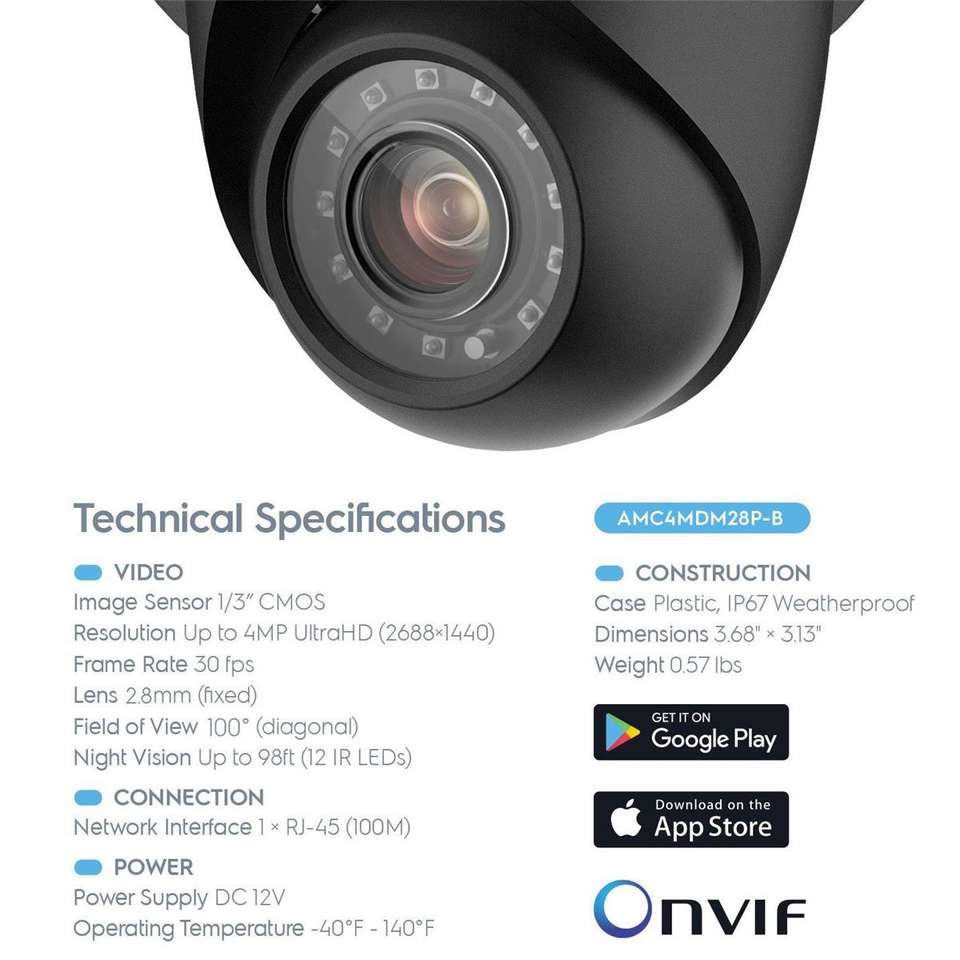 AMC4MDM28P-B Works with: Schedule recording times and view your footage on the big screen with the following recommended devices: • AMDV4M4 Amcrest UltraHD 4-Megapixel 4CH DVR • AMDV4M8 Amcrest UltraHD 4-Megapixel 8CH DVR • AMDV4M16 Amcrest UltraHD 4-Megapixel 16CH DVR
