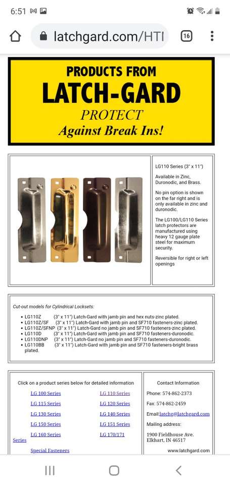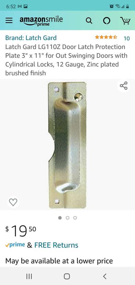 Three Latch Gard LG110Z Door Latch Protection Plate 3" x 11" for Out Swinging Doors with Cylindrical Locks, 12 Gauge. These sell for $19.50 on Amazon each, plus tax and shipping.