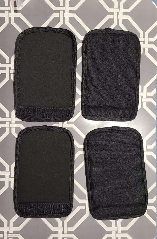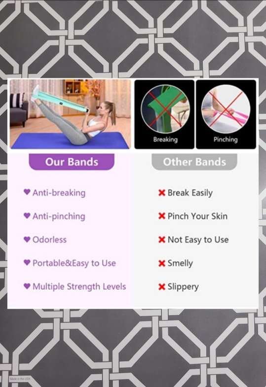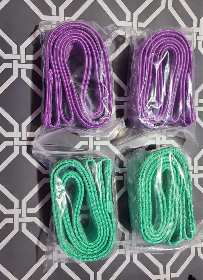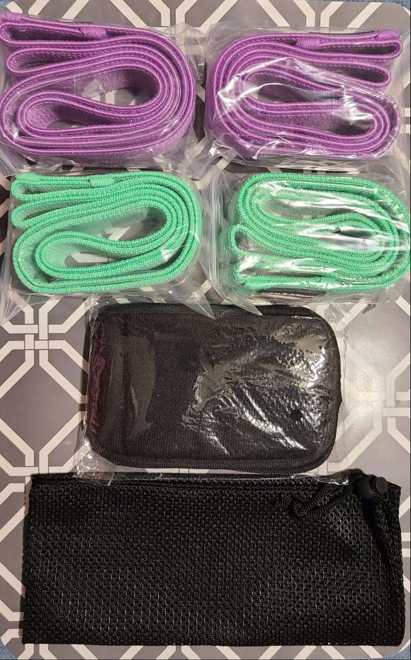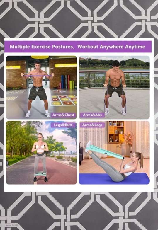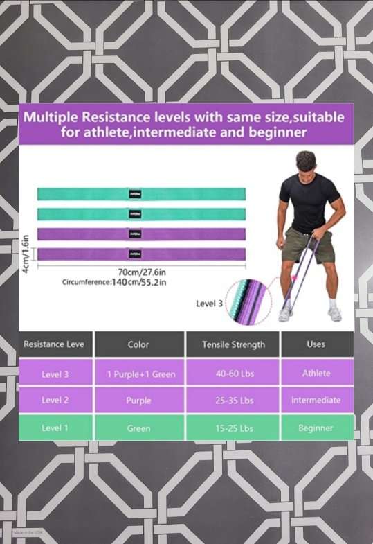 This set of 4 resistance bands are new. This also includes a mesh bag for storing them in. The durable fabric and built-in elastic line is an anti-breaking design and the fabric is made of high quality cotton polyester stretch fabric material. Also includes soft foam handles that be placed in any position of the band's circle so the force point is different each time. All my items come from a smoke free home. Any questions please feel free to contact me.