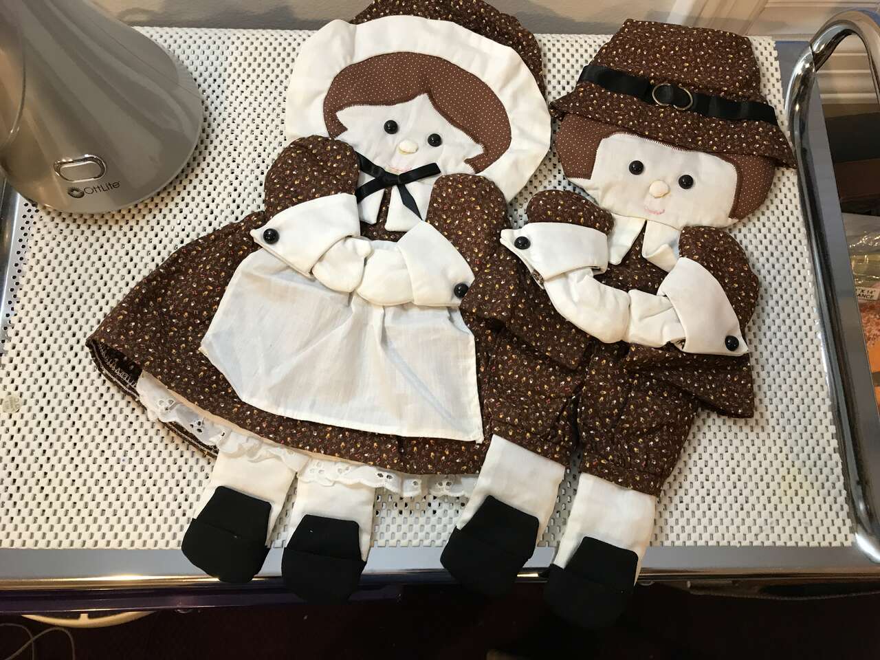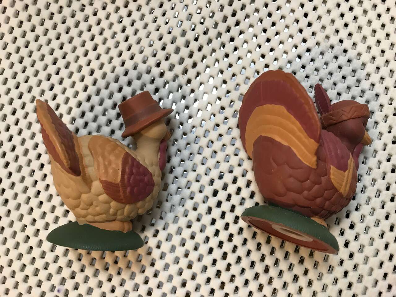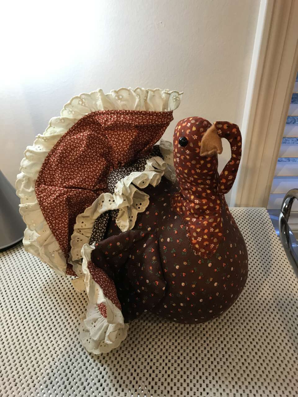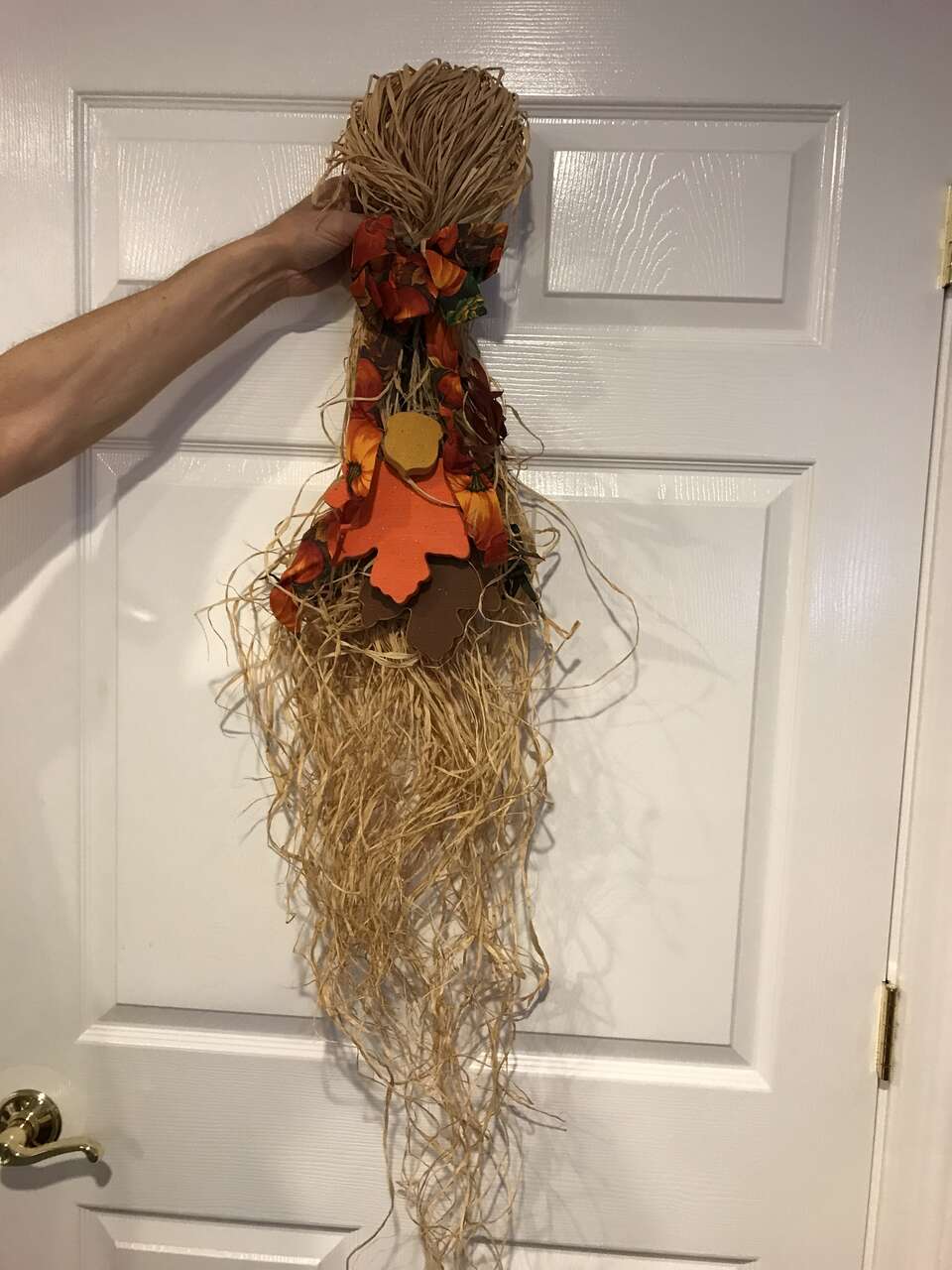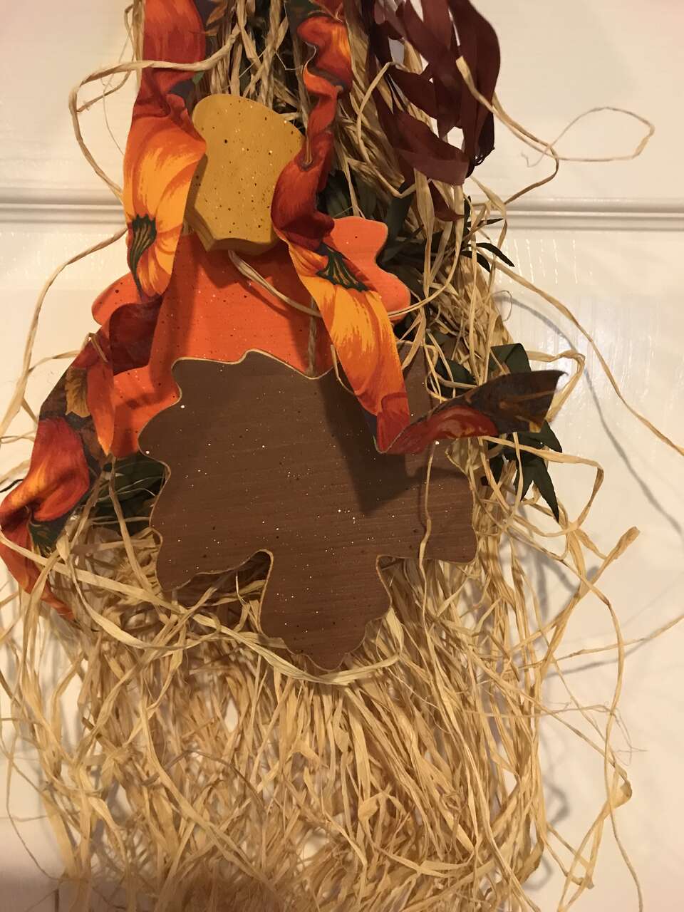Thanksgiving or Fall Decor Door Decoration, 2 large Wood Leaves and 1 Small Wood Acron, and Turkey Already Stuffed, Vintage and Thanksgiving Pilgram Children Cloth Wall Hangings 16" Tall, Vintage, and Turkey Hand Painted Cookie Jar Lid, $20.00