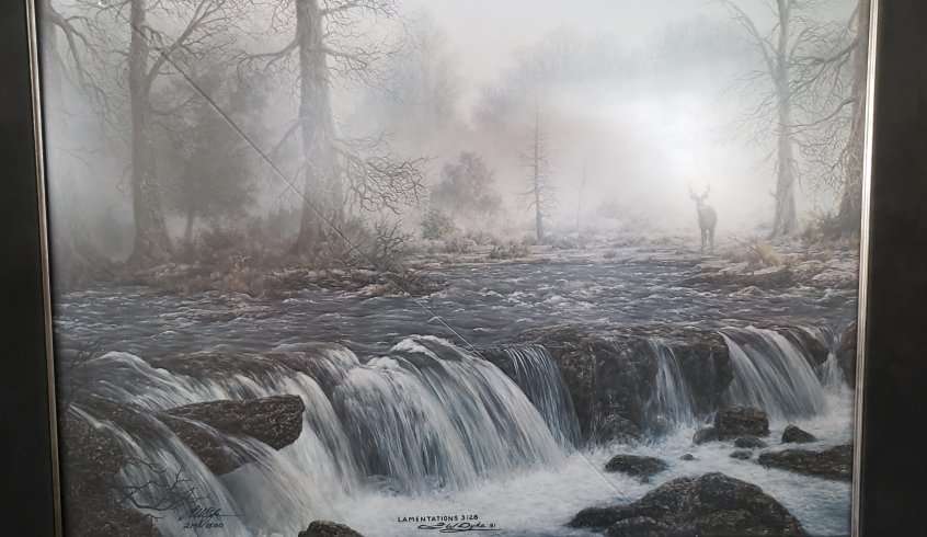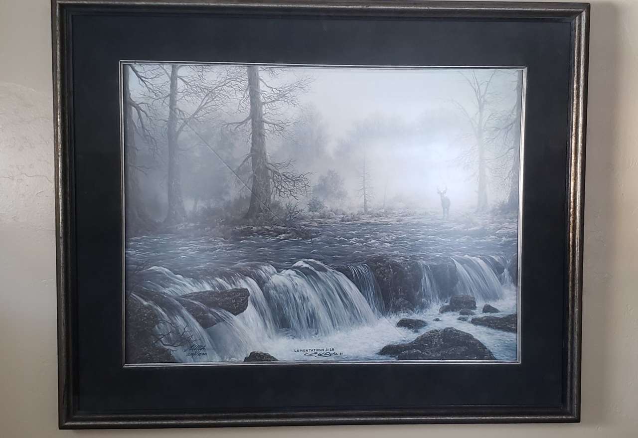 THIS LISTING IS FOR A 1981 LARRY DYKE "LAMENTATIONS 3:28" SIGNED BY LARRY AND FRAMED. IT IS NUMBER 219 OF 1500 PRODUCED IN THIS LIMITED RUN. IT COMES WITH ITS ORIGINAL GALLERY CERTIFICATE. THE FRAME SIZE IS 31 1/2"X 25 1/2". THE IMAGE SIZE IS 23 1/2"X 17 1/2". IT DOES HAVE A CRACK IN THE GLASS, BUT IS STILL DISPLAYIBLE.
