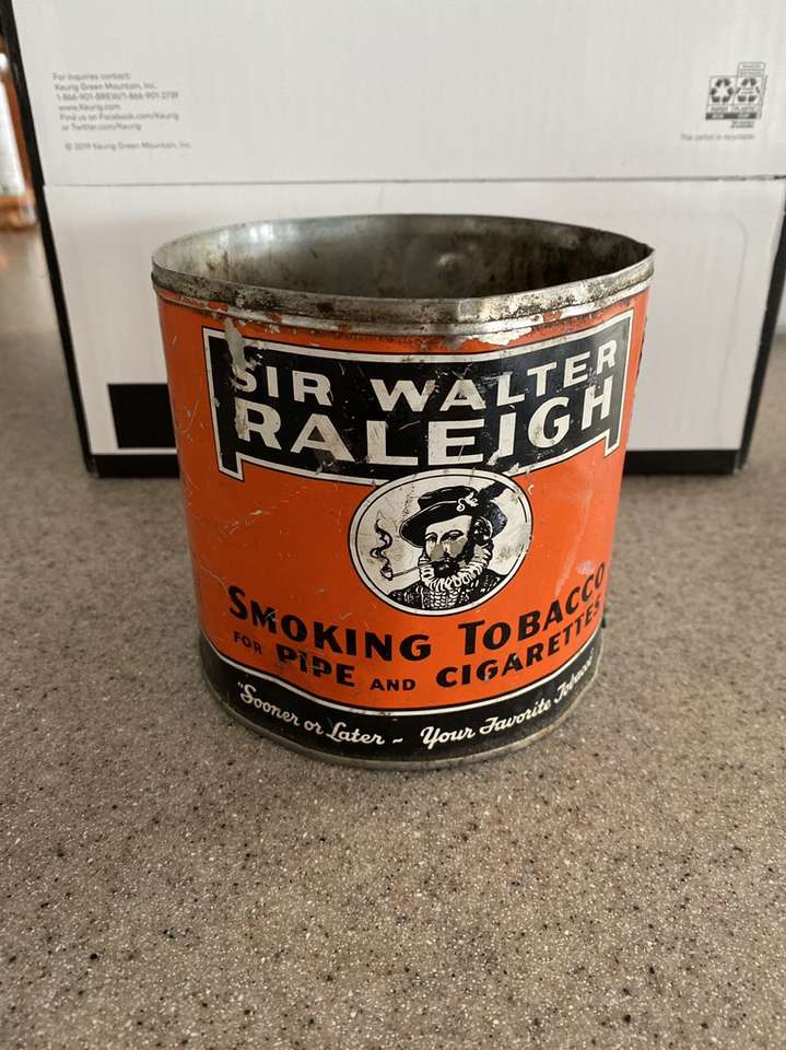 Antique Sir Walter Raleigh Tobacco Can. Item is used, has dents and scratches and the inside of the can is dirty. No lid.