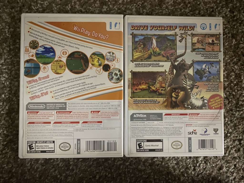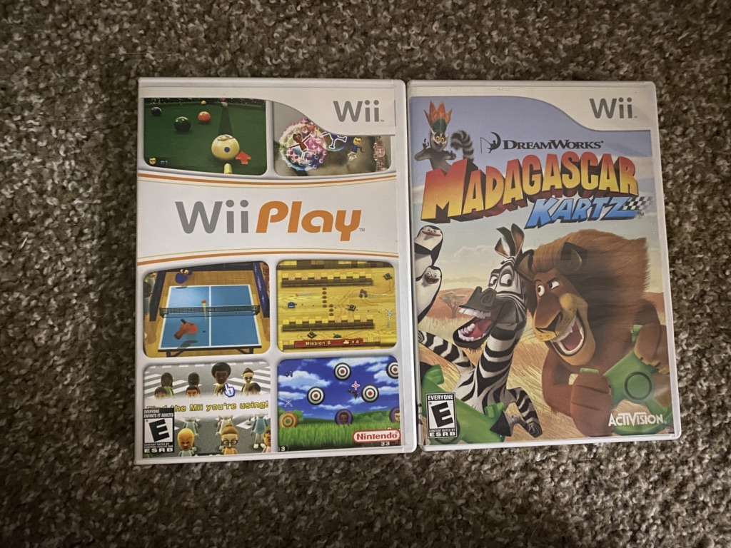 This bundle comes with black Wii console, power cord, av cord, stand, 2 black remotes, 2 black nunchucks, Wii Sports, Madagascar Kartz (almost exactly like Mariokart), Wii Play, and new accessories for many sports including pool, golf and tennis. $220