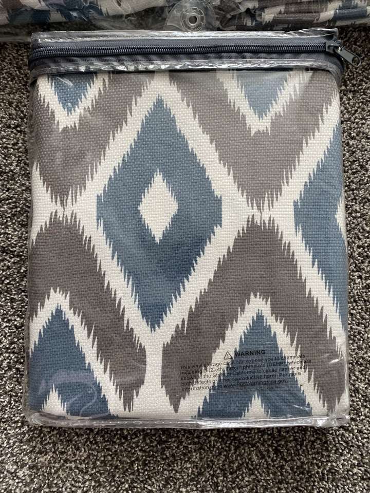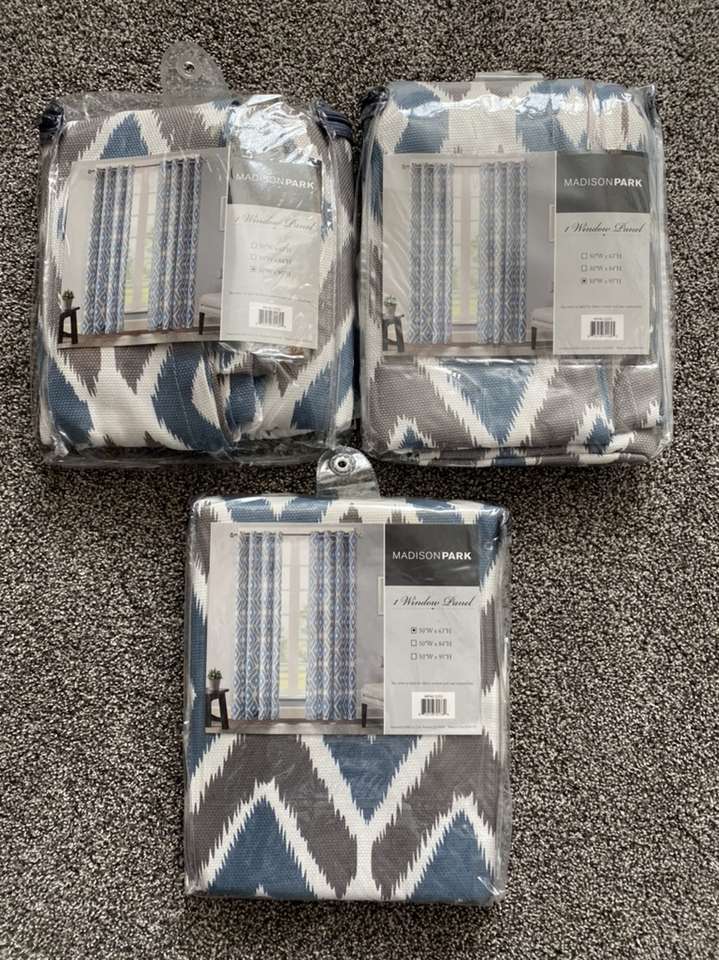 NEW! Blue and gray geometric curtain panels with metal grommets. One panel left that measures 50” x 63”. $25, cash only please.