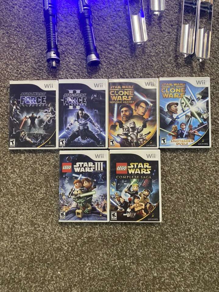 2 Wii remote light sabers, and 2 Star Wars games $150