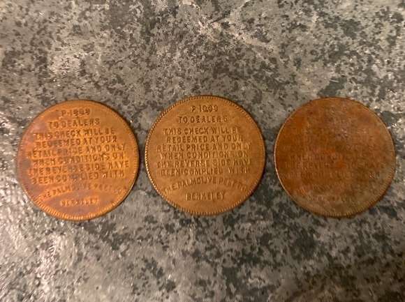Three vintage Palmolive soap tokens. As you can see in the photos, two are in great shape, the third shows signs of deterioration. Listed price is for all 3.