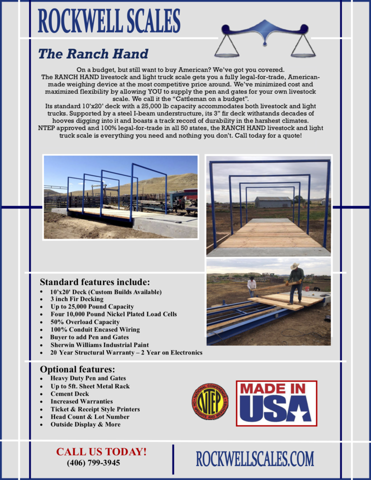 NEW Rockwell Scales Group weighing livestock scale. Legal-for-Trade, NTEP certified. 20 year structural warranty. The best warranty in the industry. 12 gauge sheet panelling over 4' tall. Schedule 40 pipe railing. 3 thick fir decking. Up to 25,000 pound capacity, 10'x20' deck. Shipping dimensions 10' wide, 20' long 24 tall. Removable top crossmembers for weighing taller items or inserting a tractor with a bale for instance. 2W Brand Square top piston latch gates. Designed to save the customer money. Customer to add the pen and gates themselves. It can be welded or bolted on. This scale comes with posts and top crossmembers to support the pen and gates. Installation is available all over the U.S. and Mexico. We can provide you with foundation blueprints and you can install it yourself or we can install it using your equipment or we can do turn key installations. Please call for installation pricing. Thank you.