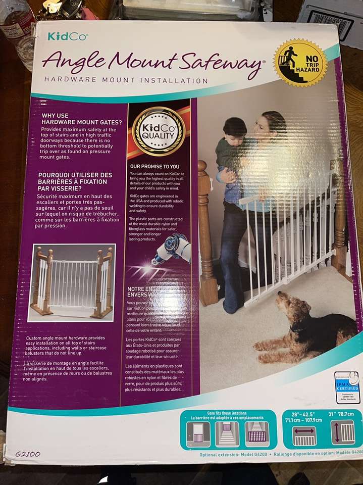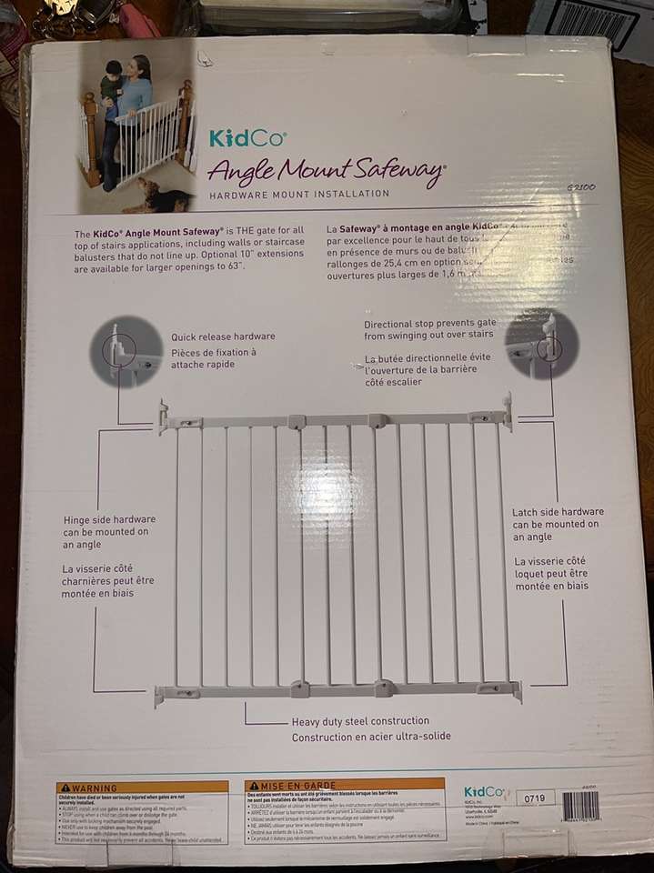 Model#: G2100 The KidCo Angle Mount Safewayis THE gate for all top of stairs applications, including walls or staircase balusters that do not line up, but can also be used in hallways or as a room divider. As a hardware mounted gate, it provides maximum safety at the top of stairs and in high traffic doorways because there is no bottom threshold to potentially trip over as found on pressure mount gates. Optional 10 extensions are available for larger openings up to 63. Perfect for all top of stairs applications, including walls that don't line up Quick release hardware allows gate to be removed when not needed Directional stop prevents gate from swinging out over stairs Adjustable width