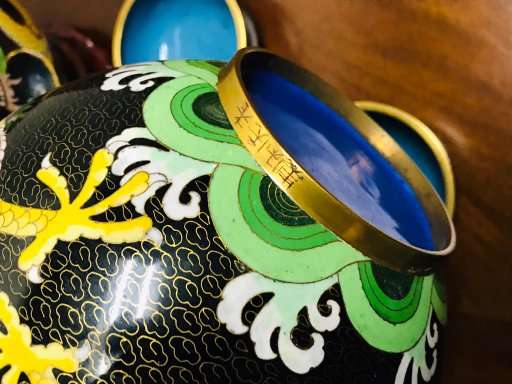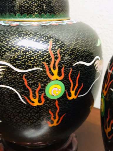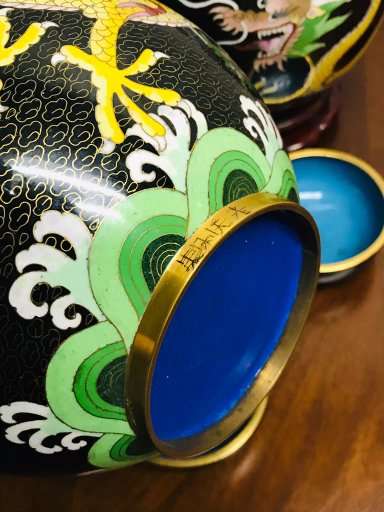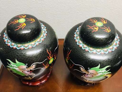 The two ginger jars are in excellent vintage condition with expected normal use. There no surface scratches. There are a few common characteristics of old cloisonné present such are tiny pit marks. There are no chips, cracks, repairs or damage.