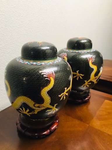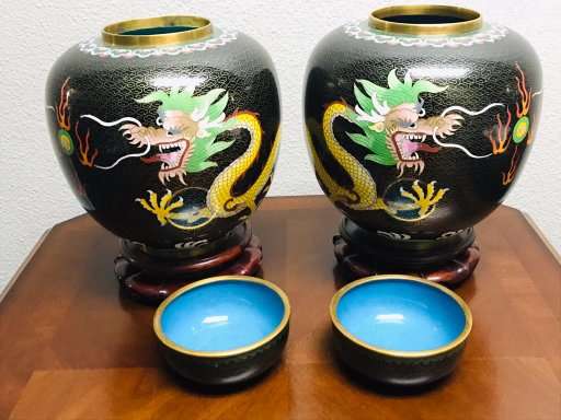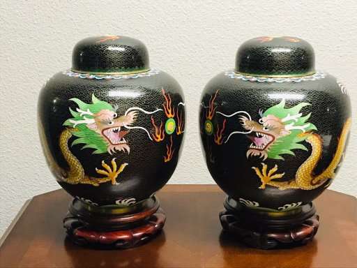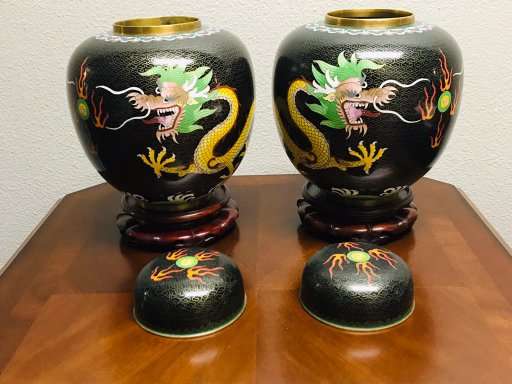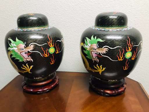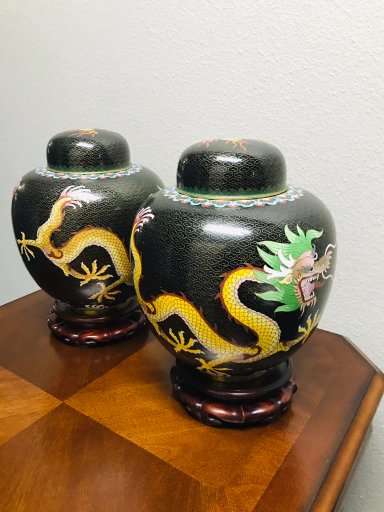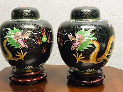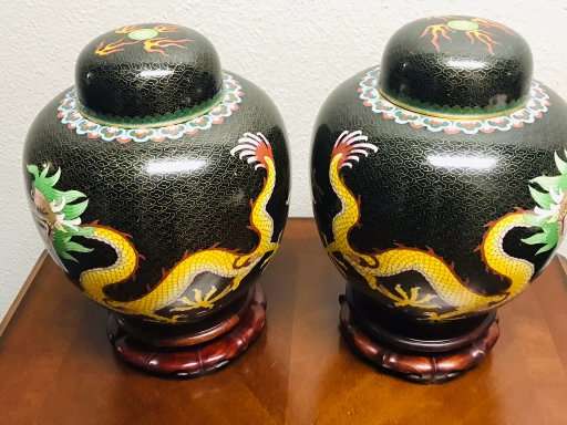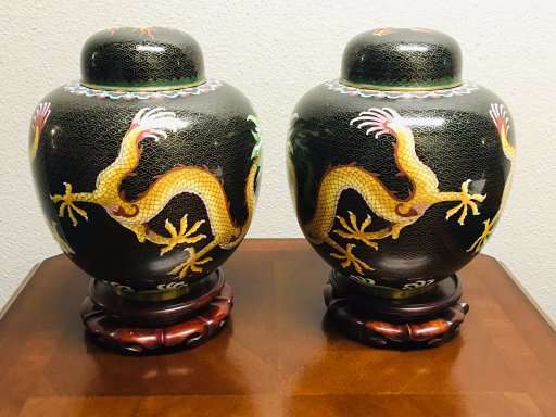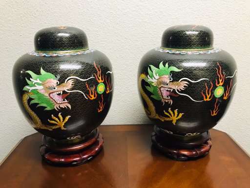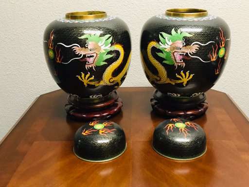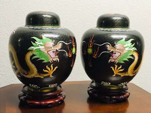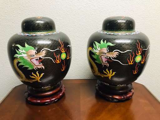 Dragons are very popular with collectors of Chinese art. These beautiful old classic Chinese cloisonne dragonginger jars are a great find for the collector and anyone who loves Chinese art. Matching old Chinese ginger jars of this size are quite difficult to find, so don't let these get away!