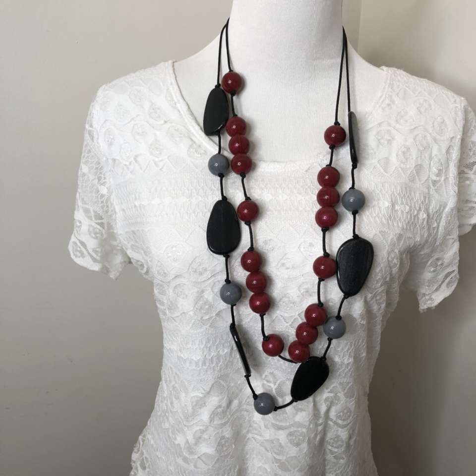 This Style (beads) available in 4 colors: Verdant Green, Heather Grey, Charcoal, & Dark Apple Red. Has a matching bracelet that can also be purchased. You are buying one necklace. Delivery available to a location convenient location when in your area for $5.