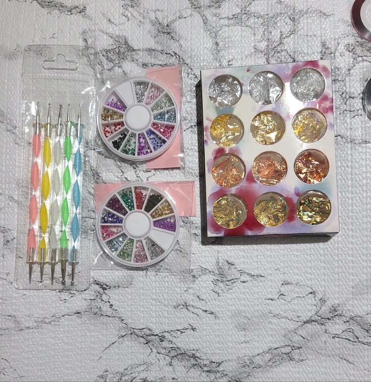 This 44pc nail art set is new. You get 15 nail brushes, 5 crystal dotting pens, 2 containers of crystal rhinestones, 12 containers of nail foil flakes, and 10 rolls of tape. All my items come from a smoke free home. Any questions please feel free to contact me.