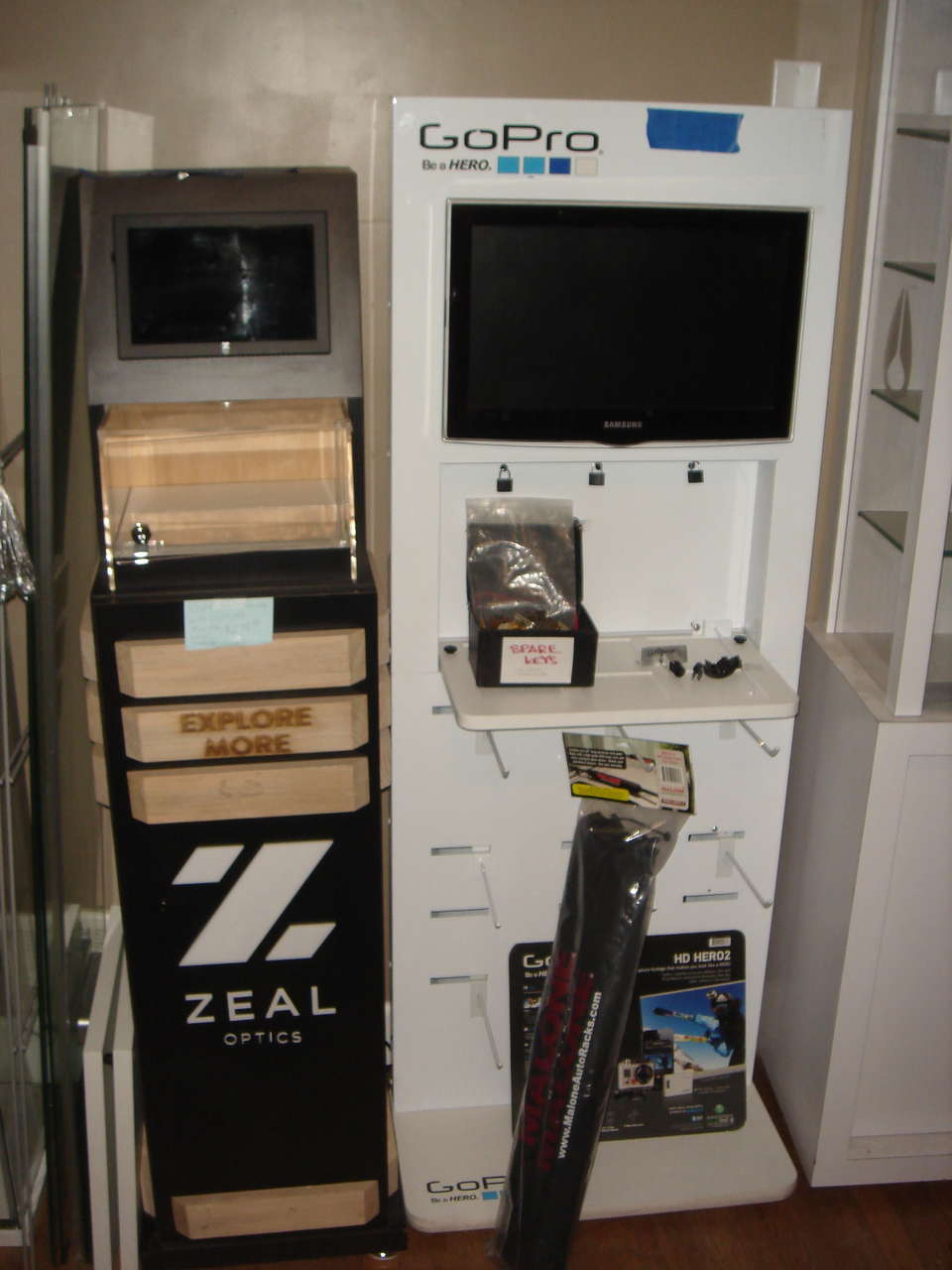 the gopro display has a tv,computer and lights for playing videos it also has 3 cable locks with keys for 150.00