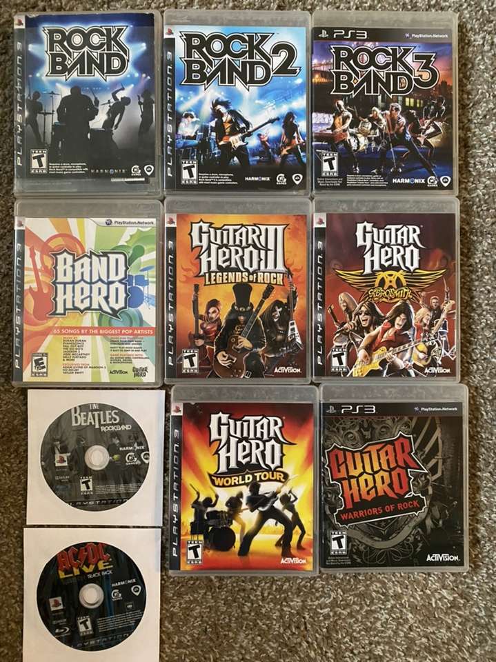 Rockband $25 Rockband2 $35 Rockband3 $50 RB Beatles $25 RB AC/DC $25 RB Green Day $40 GH Band Hero Guitar Hero 3 $30 Guitar Hero: World Tour $35 Guitar Hero Aerosmith $25 Guitar Hero Warriors of Rock $45