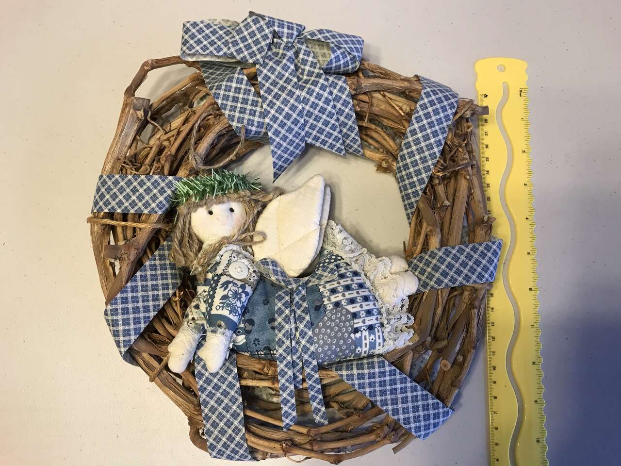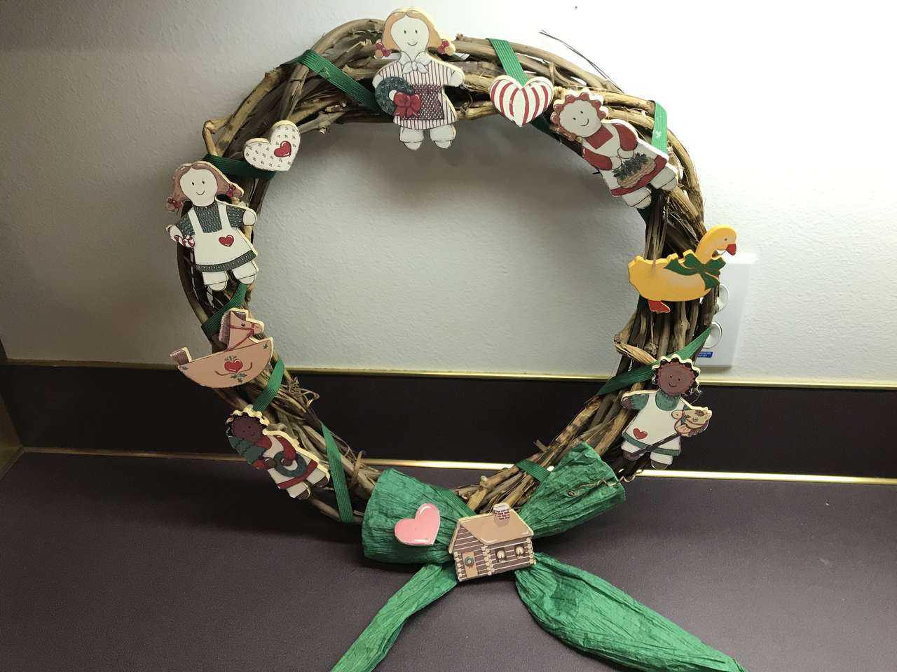 Dolls, Duck, Horse, House and Hearts decorated wood pieces attached to Grapevine wreath about 15" in diameter,