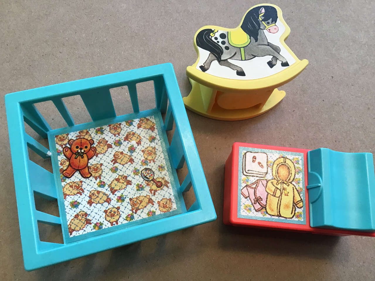Vintage playpen, rocking horse, changing table