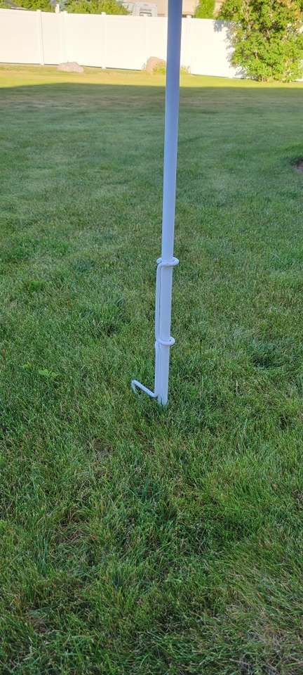 Umbrella is 58 inches diameter, adjustable up and down and tilts. Comes with a lawn anchor for breezy days. Anchor can be easily pushed into lawn an then Umbrella poll can be inserted in anchor. If you want the anchor alone it is $13.00. Both are in working condition.