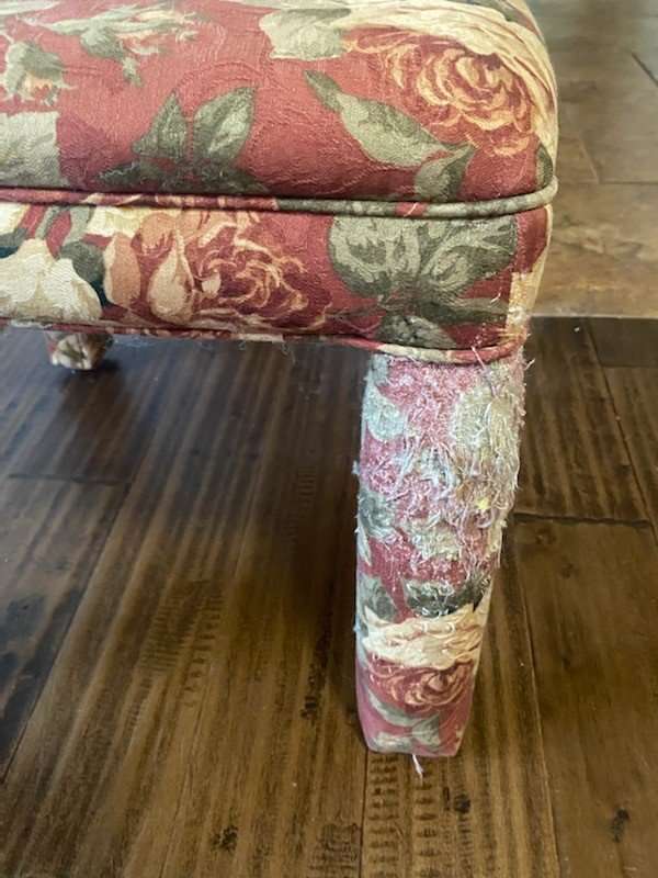 Legs have been used as scratching post. Need rewrapped. Rest is sturdy good condition. Great project chair. 17" wide, 20" deep. Seat 17" total height 36 inches.
