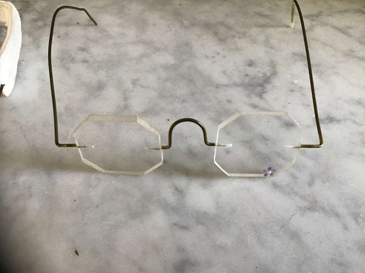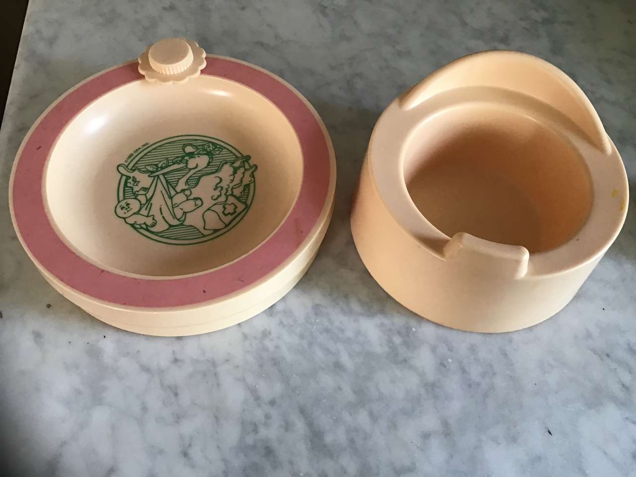 Feeding Bowl,Potty Chair, Retainer, Glasses with a small purple flower in the corner