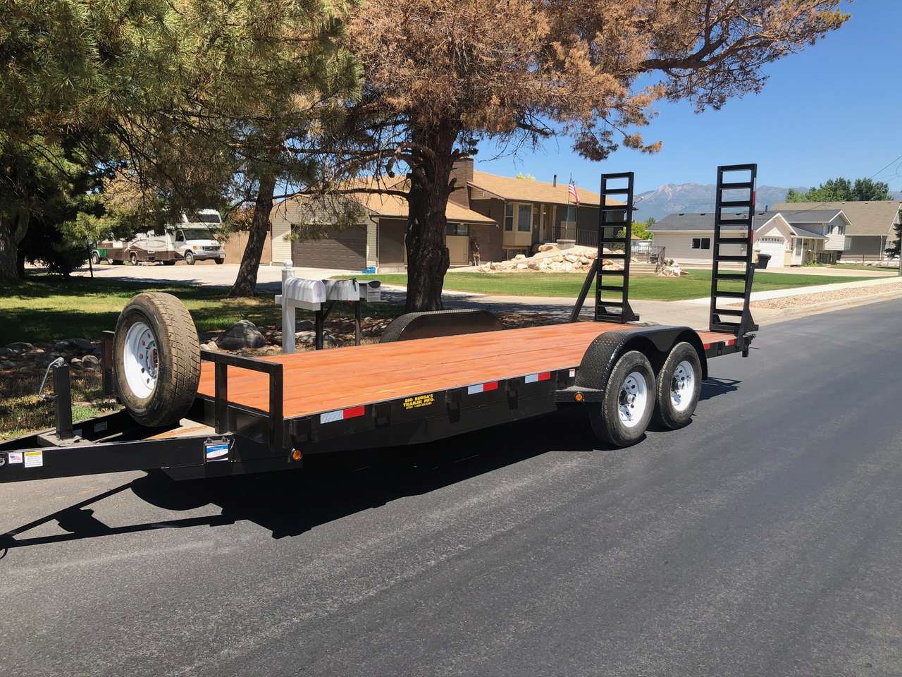 For rent is a nice 20 foot car hauler heavy duty double axel flatbed trailer. It has 14,000 lb axel rating so it can hold up to 10,600 lbs on it.
