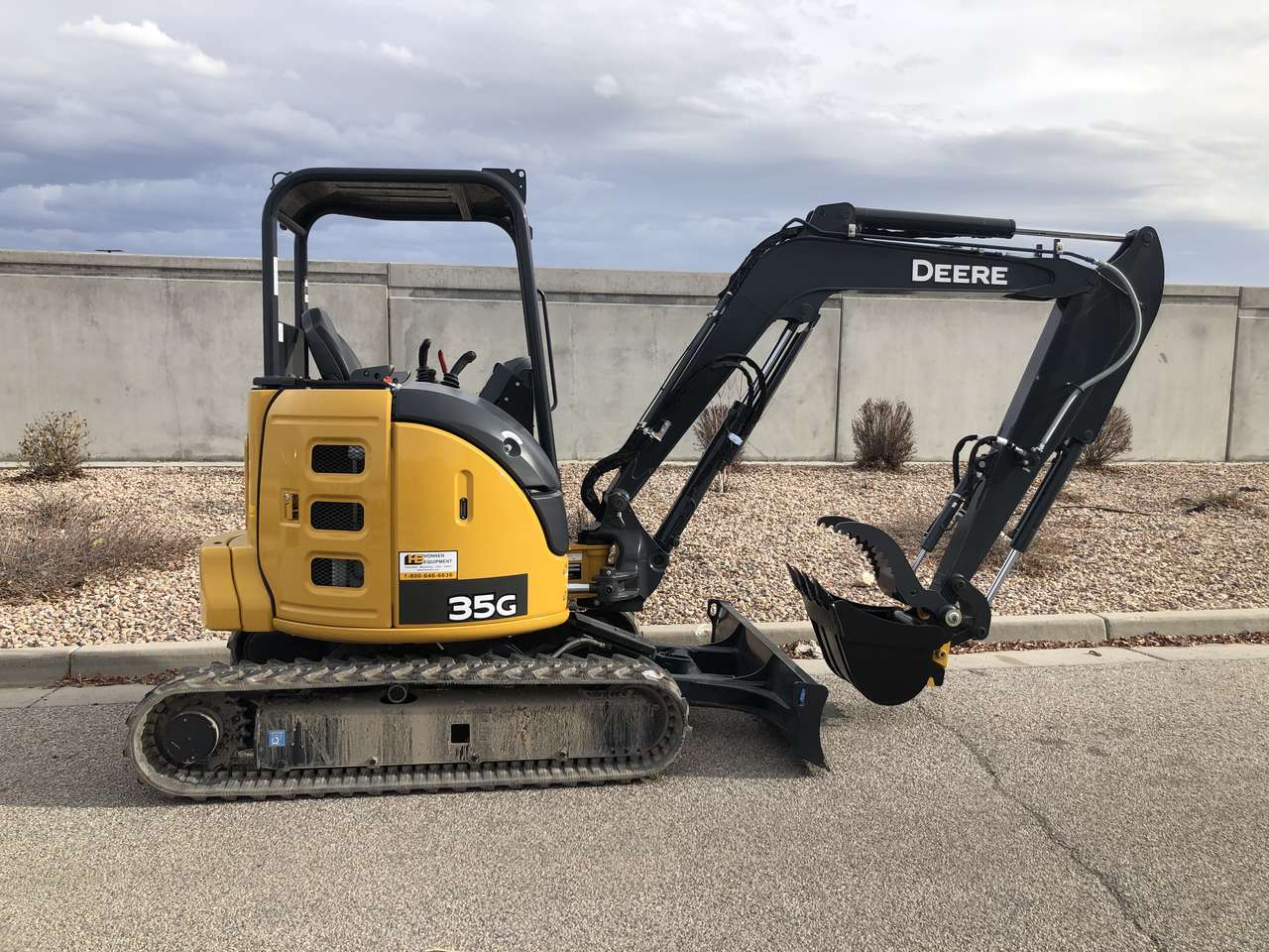 35G weighs 8300 lbs, digs 10’ 8”, has cab and thumb, and is 69” wide. Awesome for most any project!