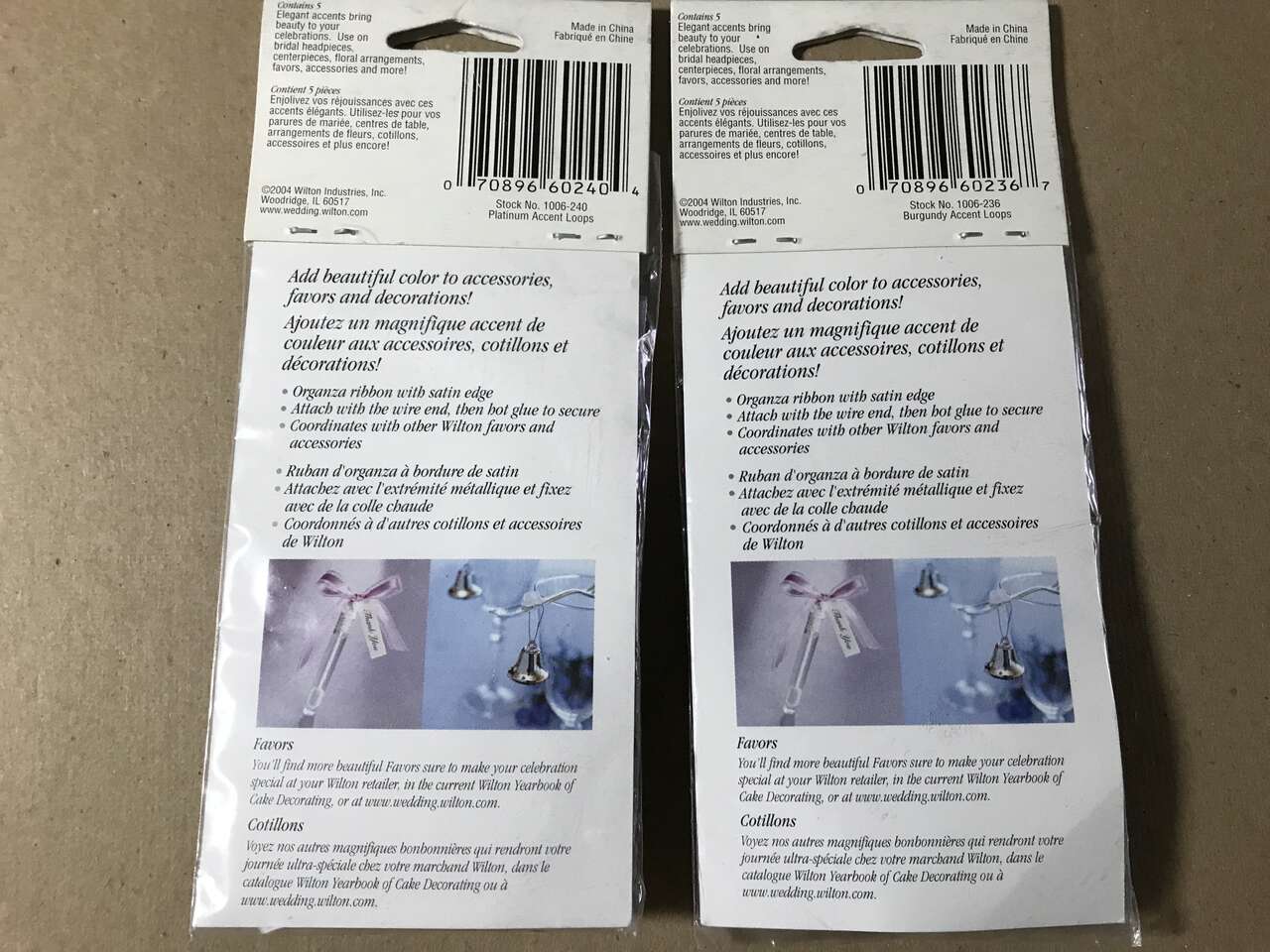 Wilton Elegant Accent Loops 1 package of Red and 1 package of Silver Organza Ribbon Satin Edge. Contains 5 in each package. Use on bridal headpieces, centerpieces, floral arrangements favors, Wedding Cake accessories and Scrapbook. $5.00