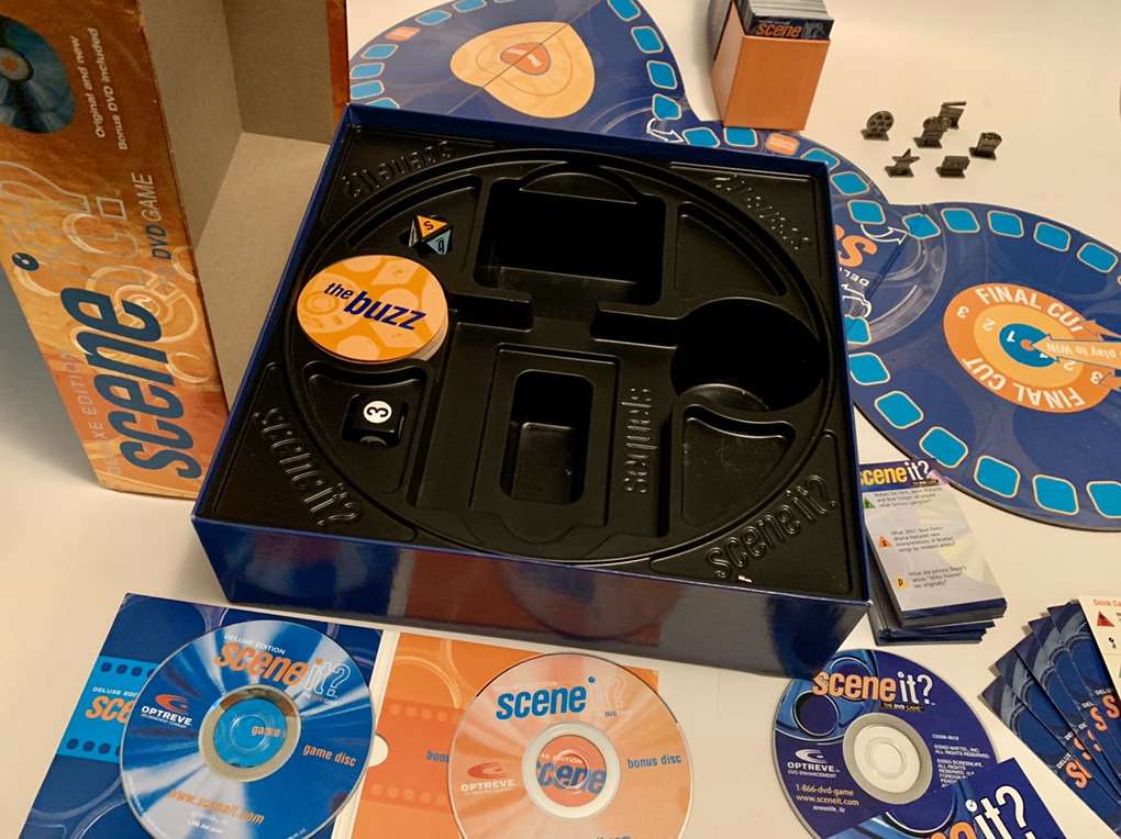 Scene It? Movie Trivia DVD (with a Bonus Disc) Board Game complete with all the pieces: Game Board, Trivia Cards, Buzz cards, 6 Metal Player Tokens, Player reference cards, Instructions, four and six sided Dice. The first of the 3 discs has rub marks but still work fine. Send me a Message if you’re interested