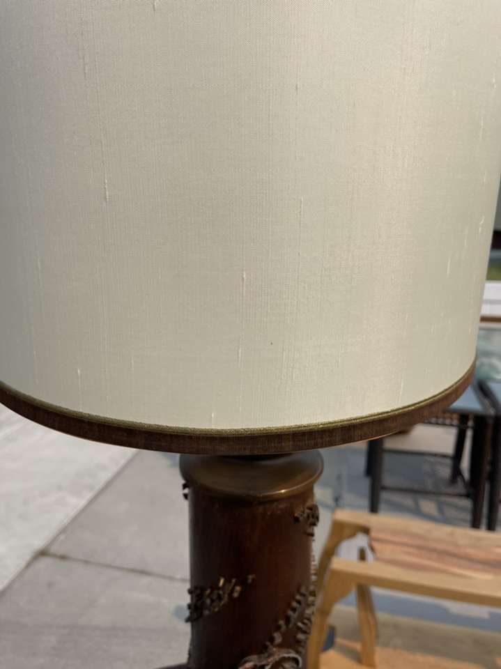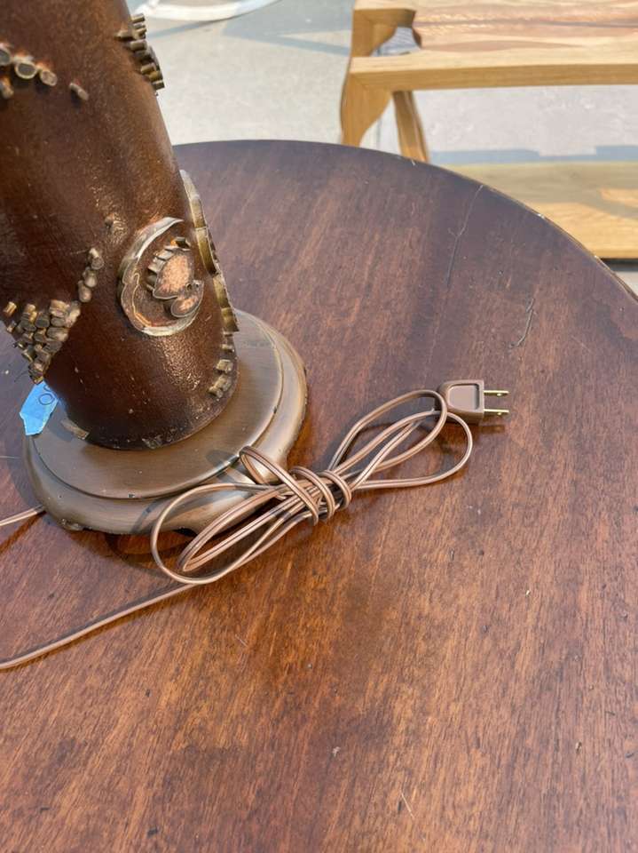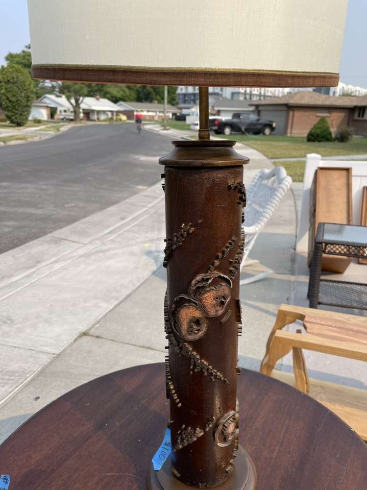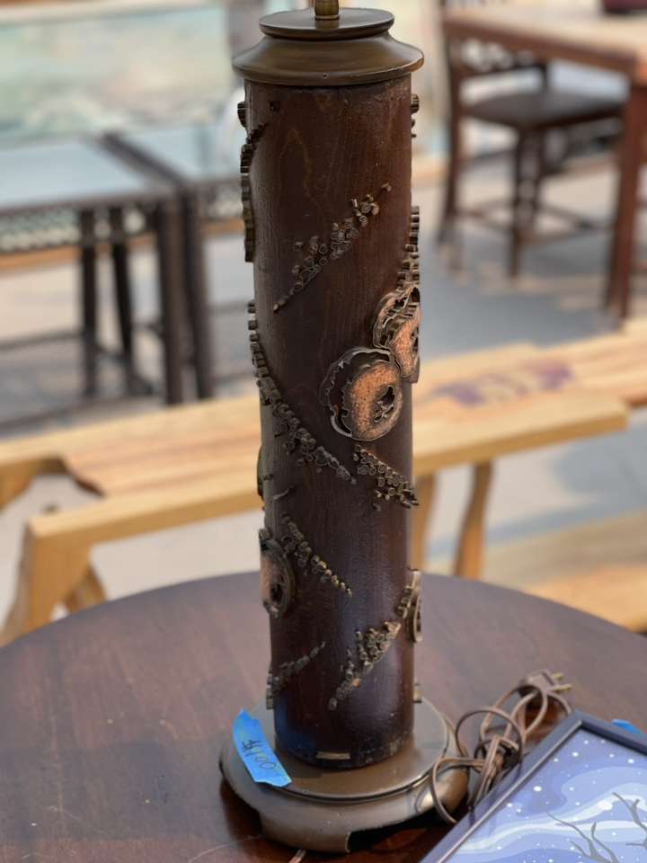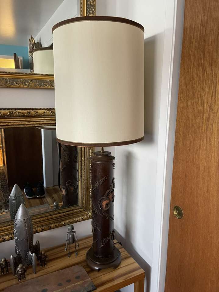 This beauty is a work of art crafted in NYC classic 1960 mid century modern wall paper roller lamp with original shade in excellent condition ! The base is made from an original wall paper print roll wood and metal ! Signed by the artist