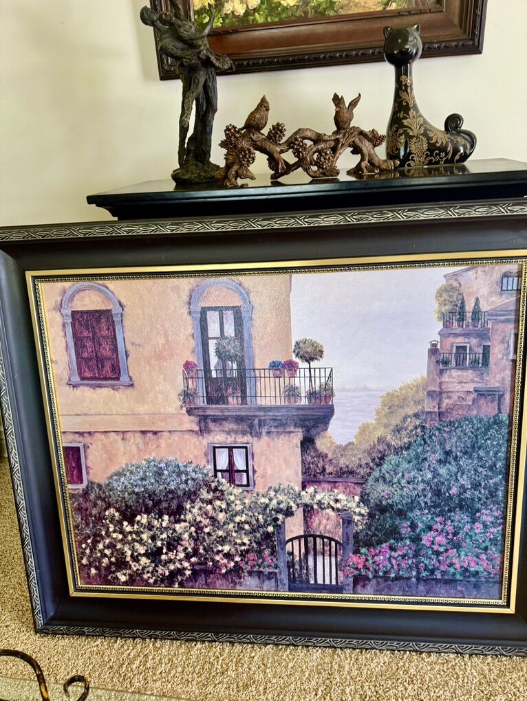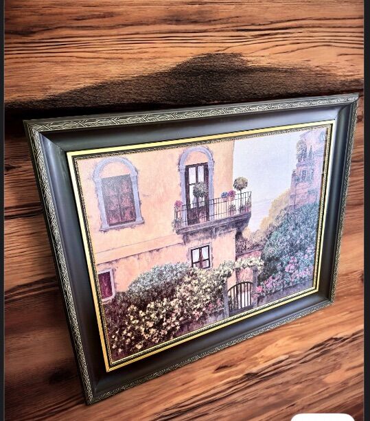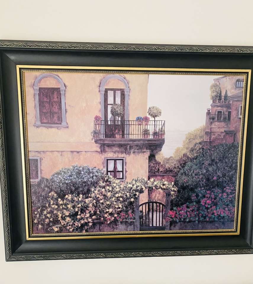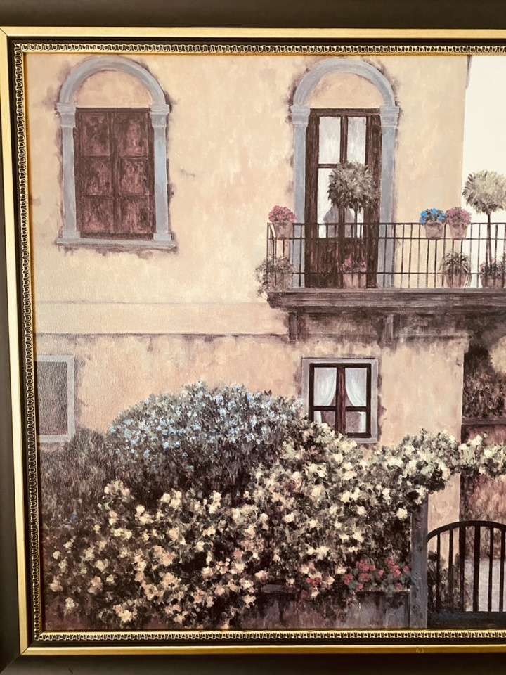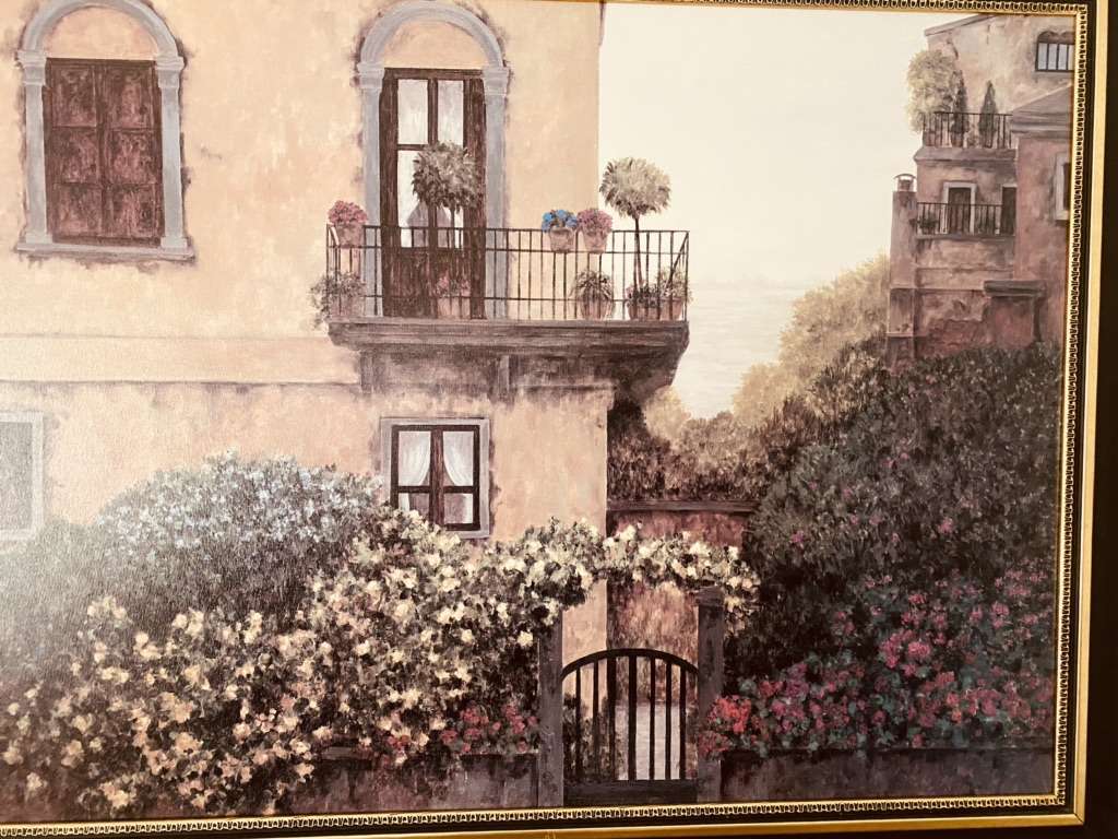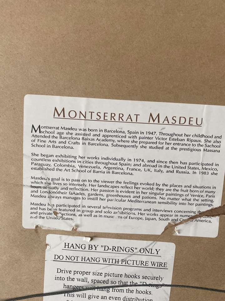 artwork in the image is titled Esquina Al Mar by Montserrat Masdeu. It depicts a charming scene of a building with a balcony overlooking the ocean, with lush greenery and flowers. Key details about the artwork include: • Title: Esquina Al Mar • Artist: Montserrat Masdeu • Subject: Coastal scene with a building, balcony, and greenery •
