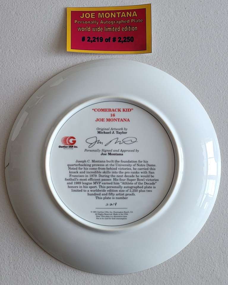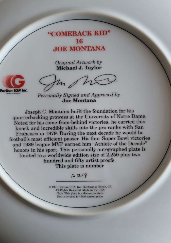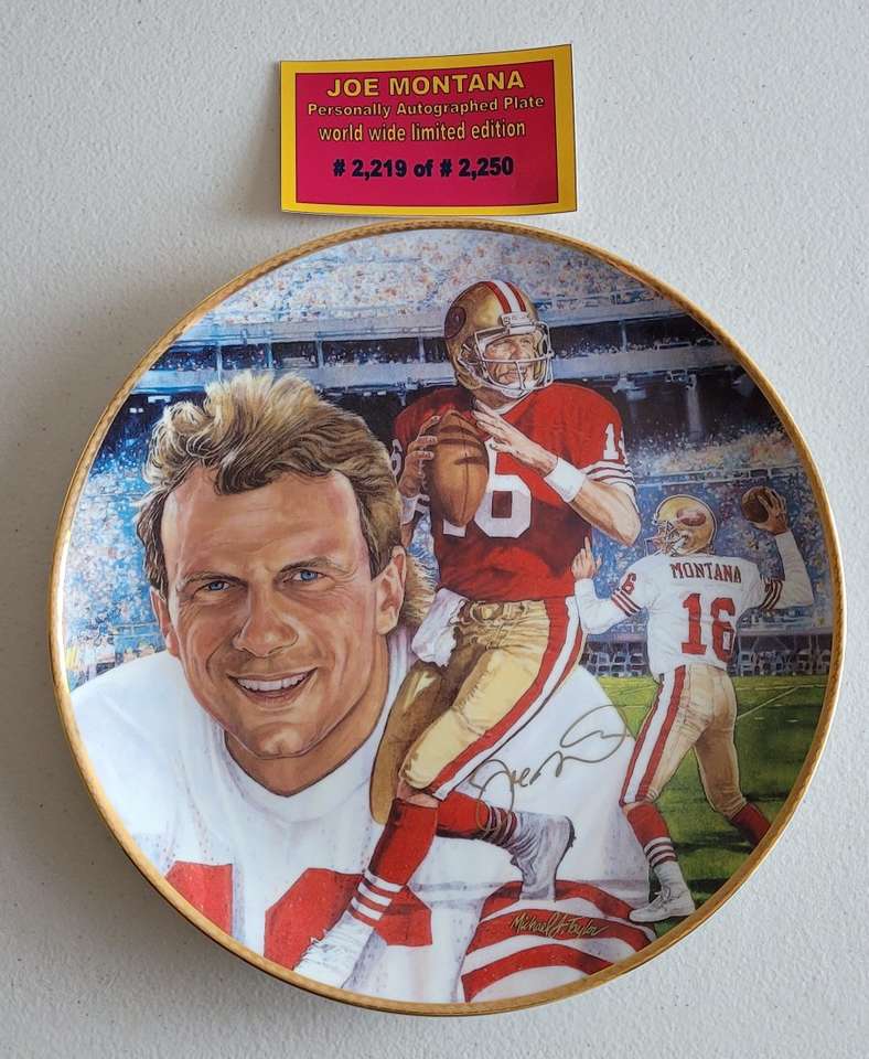 This is a Joe Montana personally autographed 10" plate, world wide limited edition...#2,219 of 2,250. Still in it's original box. $110...cash or Venmo only. TEXT 559-707-5899. Thanks for looking!