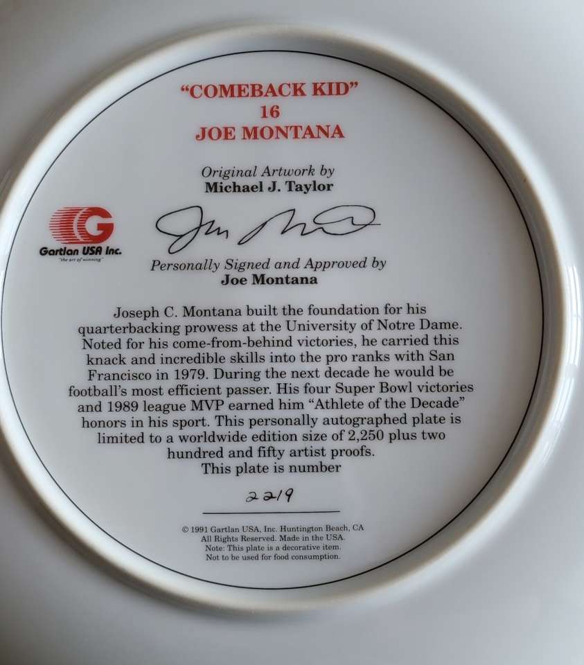 This is a Joe Montana personally autographed 10" plate, world wide limited edition...#2,219 of #2,250. Still in original box. $110...cash or Venmo only. TEXT 559-707-5899. Thanks for looking!