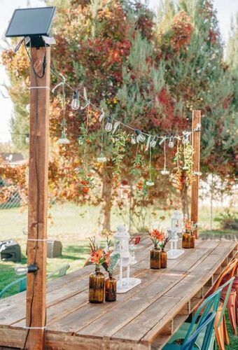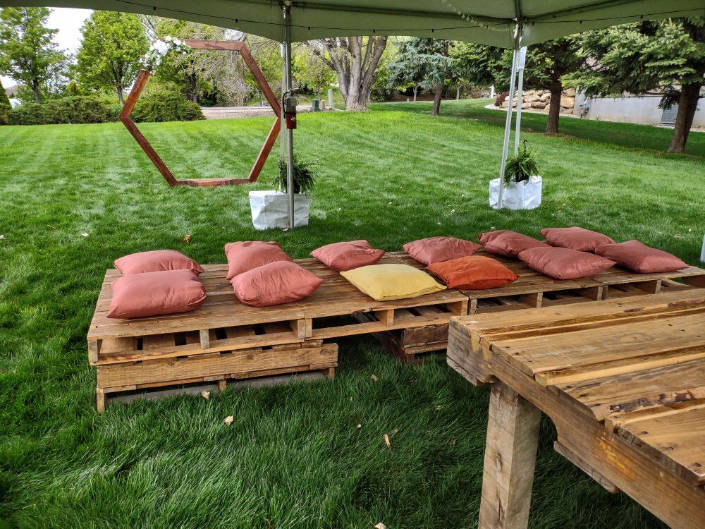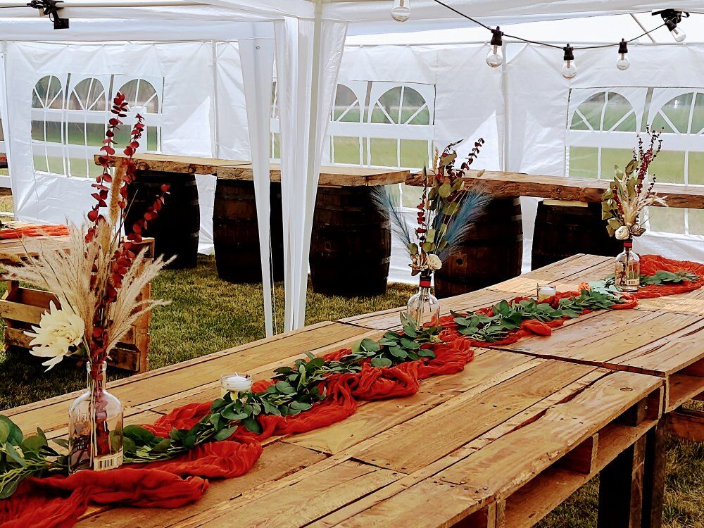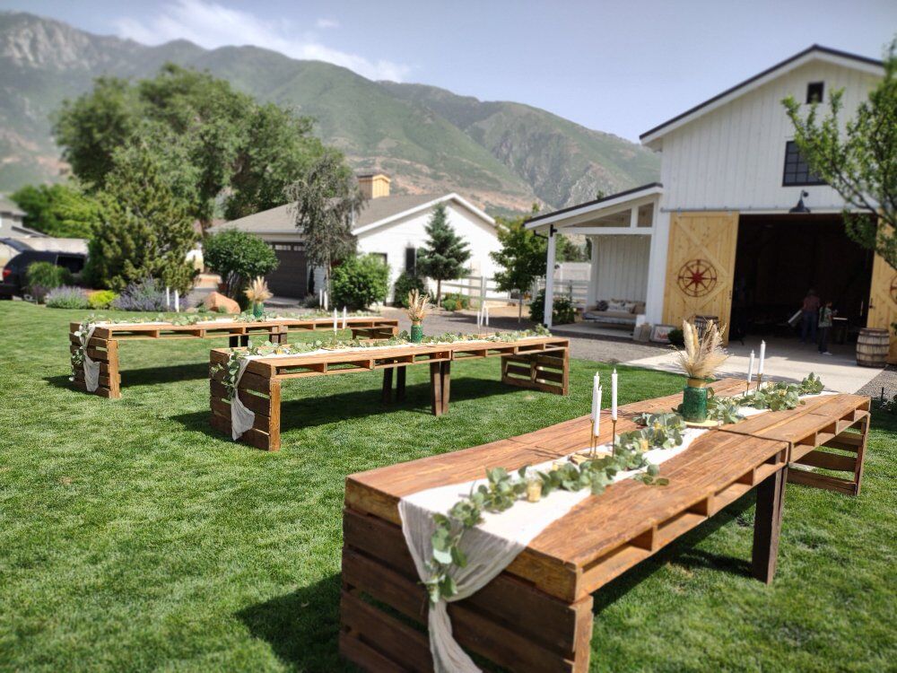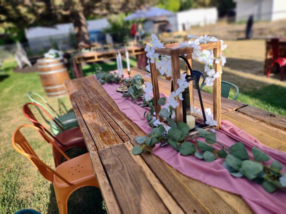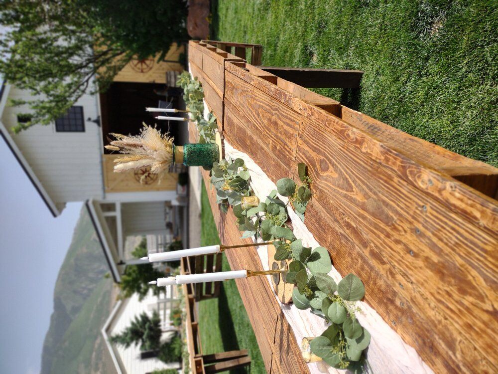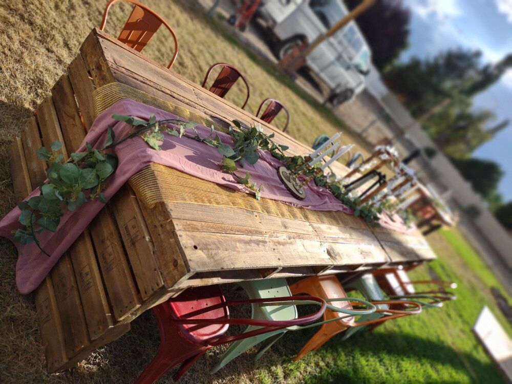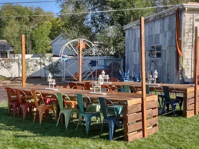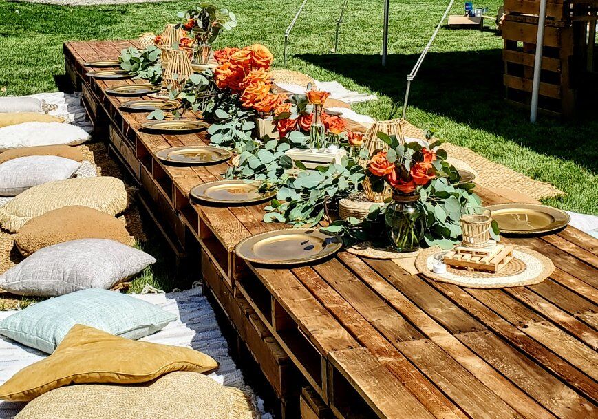 We have hand made sturdy rustic, farmhouse, can be modified for any theme, sitting and chair pallet tables for event & wedding decor rentals. These pieces can be a great addition to your holiday, business, or wedding event. Table sizes range from long to short. These tables can be set up and decorated to your liking as food, serving tables, game tables, or as display pieces. Rental Prices: Varies depending on size call for details.We have hand made sturdy rustic, farmhouse, can be modified for any theme, sitting and chair pallet tables for event & wedding decor rentals.