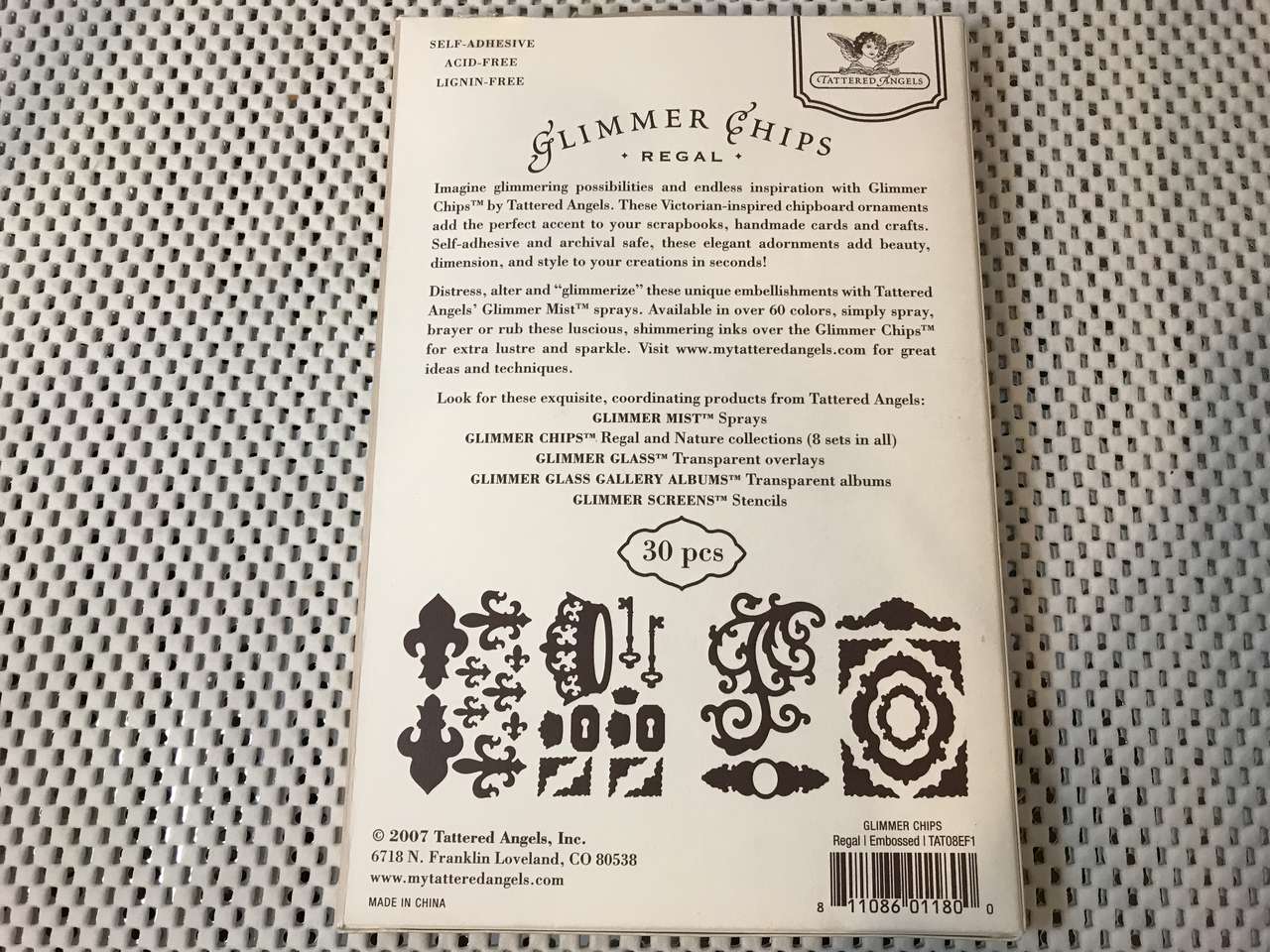 Glimmer Chips Regal, Embossed, The Crème Collection, Self-Adhesive Acid-Free, Lignin-Free, 30 pieces, Tattered Angels brand, $5.00