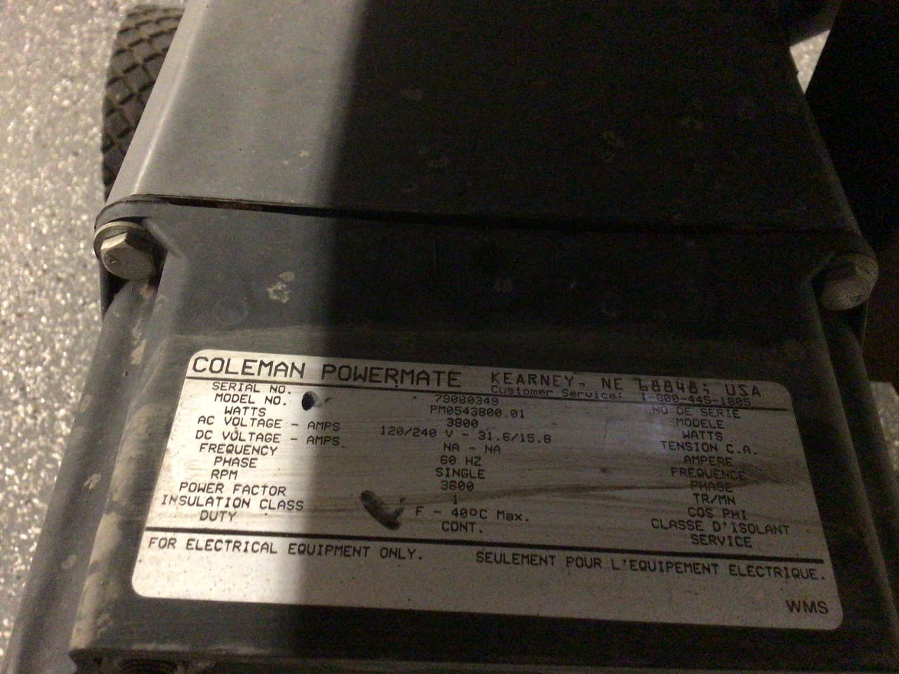 Coleman Powermate 3800 watt generator. It is powered by a 7.5 hp Briggs and Stratton engine. This is an older unit, but starts right up and works well. It has (2) 120v plugs and (1) 240v plug. No email, no codes and NO SCAMMERS!