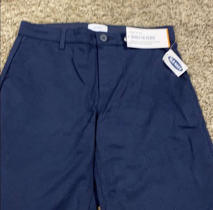Brand New with tags Boys Navy Blue Khaki shorts Old Navy Uniform Line Button and zipper closure Adjustable waist Front slant pockets on hips 1 pocket on the bum Belt loops Built in flex Size available: 10 $5 Smoke and pet free home Located on American Fork Cash/Venmo
