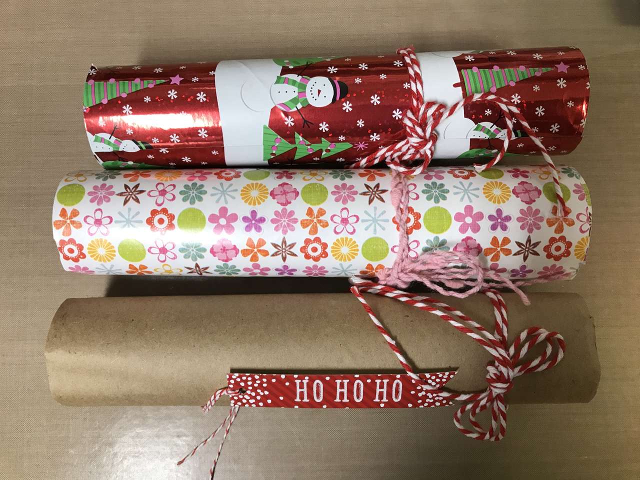 4th picture from the end is a muslin draw string candy or gift sack, 4 1/4" x 5 1/2", and Pictures following muslin bag contains 3 gift tubes all for $5.00. Holding capacity of each Tube is 4 3/4" long. The paper is about 2 1/2" longer on each end so you can tie the twine on each end. Tie off 1 end then fill it with Christmas Candy, toys, socks, money etc. After filling the tube, tie off the other end with the remaining twine provided. The last picture is an idea of what to do with tubes.