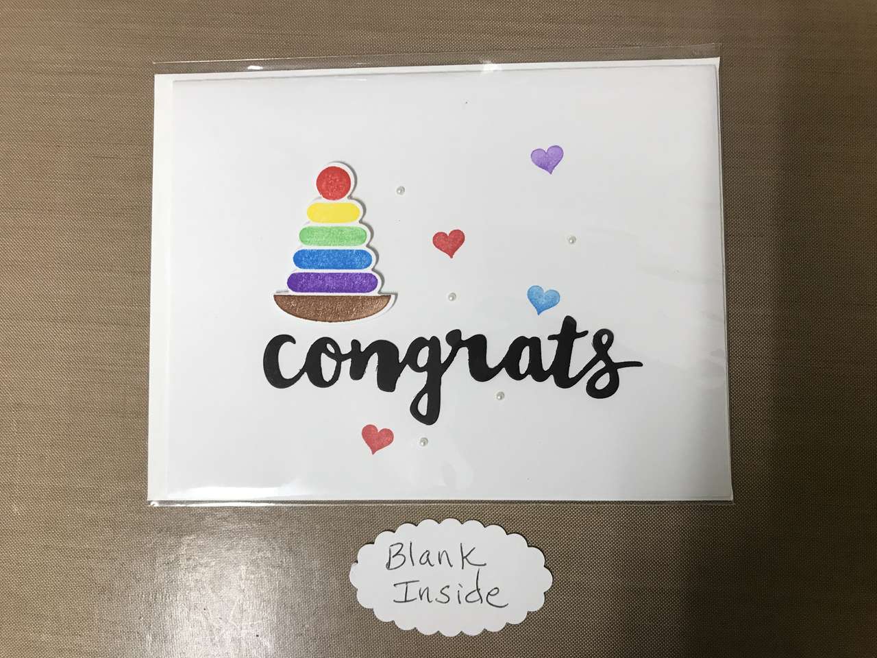 All Greeting Cards come with an envelope and are sealed inside a cellophane envelope. The message pictured next to some cards is the message that is stamped inside otherwise they are blank inside. If you want a message inside a card that is blank such as happy birthday, I would be happy to stamp it for you. Just let me know. Size of each card is 4 1/4" x 5 1/2". Last card is 3"x3"