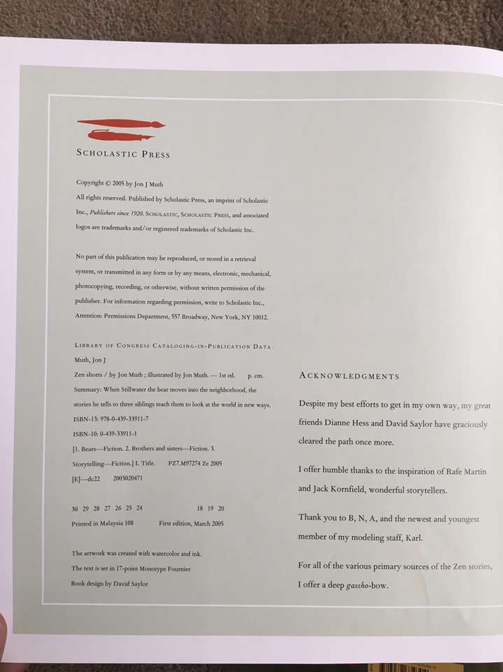 Set of 5 gorgeous hardback picture books by Jon J Muth: Zen Shorts (2005; Caldecott Honor Book), Zen Ties (2008), Zen Ghosts (2010), Zen Socks (2015), and Hi, Koo!: A Year of Seasons (2014). Scholastic Press. All in excellent condition, including dust jackets. Text if interested. Cash or Venmo.
