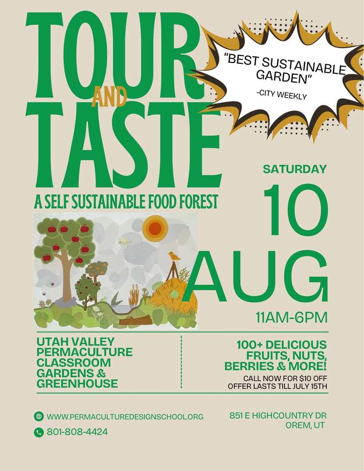 Deadline for $10 off tickets is this Friday 6pm call 801 808 4424 SIGN UP for 11am, 1pm, 3pm or 5pm educational TOUR and Taste some of 37 kinds of berries, 11 kinds of dried cherries, 2 kinds of Mulberries and a cooler Food Forest of moisture, shade, Bees, birds, and wildlife. 100 fruit and nut trees. Rainwater passive systems, little other water. UVPCGG on Facebook: Utah Valley Permaculture Classroom Gardens & Greenhouse and call 801 808 4424 SNEAK PEAK OF FOOD FOREST: (Only 1/10th of it Zone 1 Kitchen Garden: