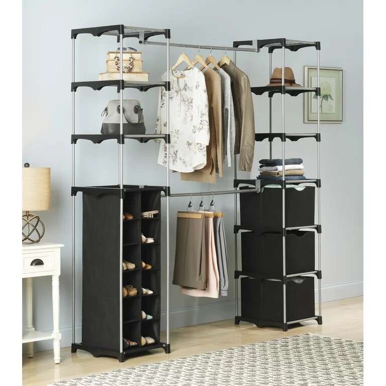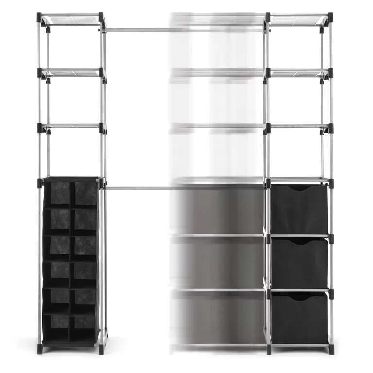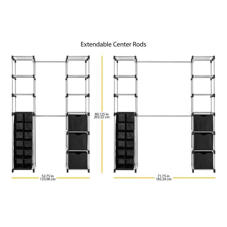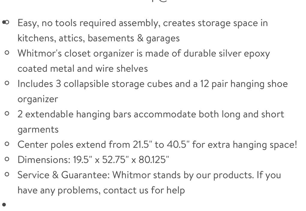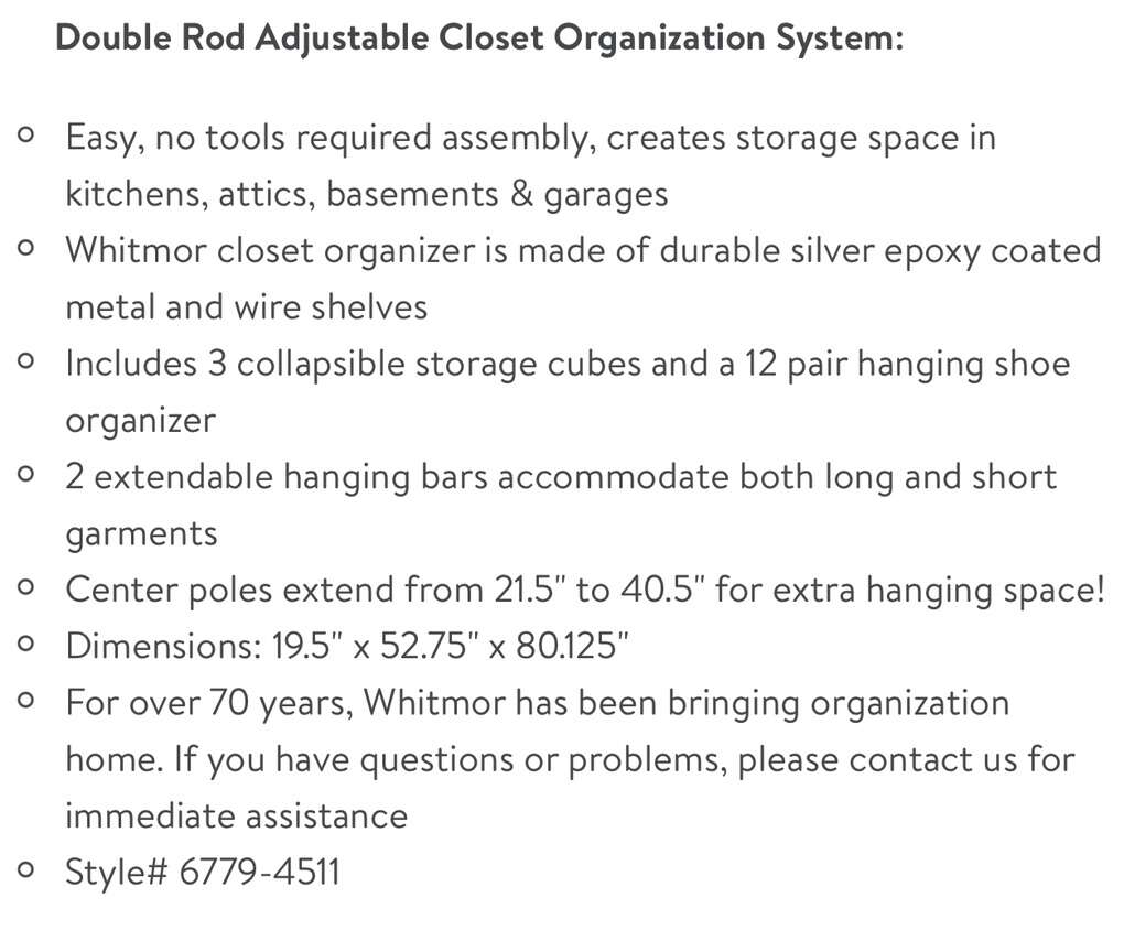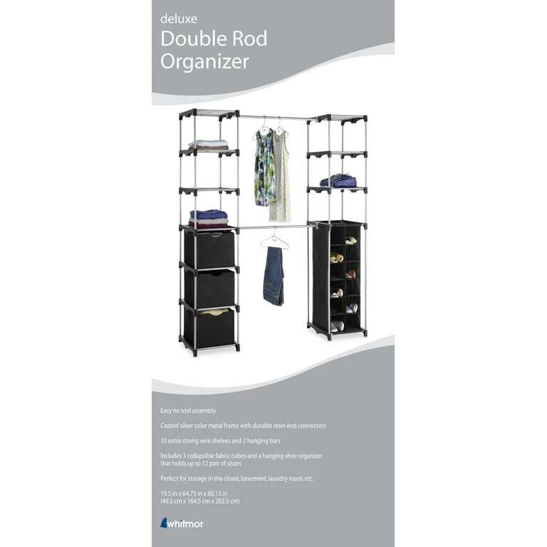 Double Rod Adjustable Closet Organization System: Easy, no tools required assembly, creates storage space in kitchens, attics, basements & garages Whitmor closet organizer is made of durable silver epoxy coated metal and wire shelves Includes 3 collapsible storage cubes and a 12 pair hanging shoe organizer 2 extendable hanging bars accommodate both long and short garments Center poles extend from 21.5 to 40.5 for extra hanging space! Dimensions: 19.5 x 52.75 x 80.125