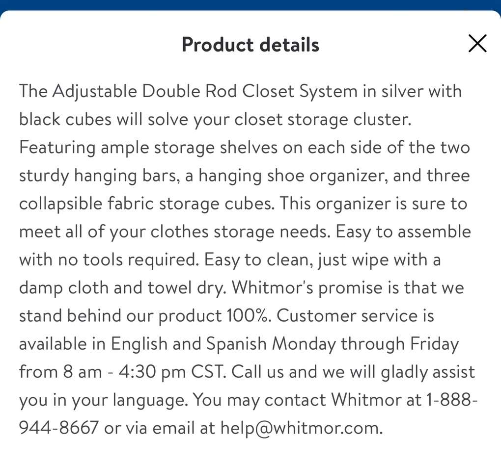 The Adjustable Double Rod Closet System in silver with black cubes will solve your closet storage cluster. Featuring ample storage shelves on each side of the two sturdy hanging bars, a hanging shoe organizer, and three collapsible fabric storage cubes. This organizer is sure to meet all of your clothes storage needs. Easy to assemble with no tools required. Easy to clean, just wipe with a damp cloth and towel dry. Whitmor's promise is that we stand behind our product 100%. Customer service is available in English and Spanish Monday through Friday from 8 am - 4:30 pm CST. Call us and we will gladly assist you in your language. You may contact Whitmor at 1-888-944-8667 or via email at help@whitmor.com. Easy, no tools required assembly, creates storage space in kitchens, attics, basements & garages Whitmor's closet organizer is made of durable silver epoxy coated metal and wire shelves Includes 3 collapsible storage cubes and a 12 pair hanging shoe organizer 2 extendable hanging bars accommodate both long and short garments Center poles extend from 21.5 to 40.5 for extra hanging space! Dimensions: 19.5 x 52.75 x 80.125 Service & Guarantee: Whitmor stands by our products. If you have any problems, contact us for help