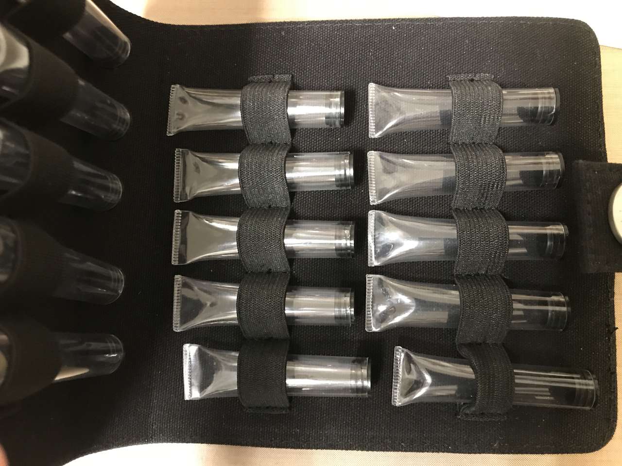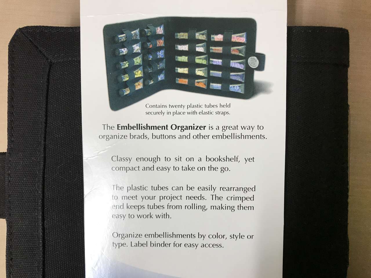 Lasting Impressions Embellishment Organizer, New, 7-1/2”x6-1/2” Size when closed. Holds 20 plastic tubes. Tubes included. This is a great way to organize brads, buttons and other embellishments.