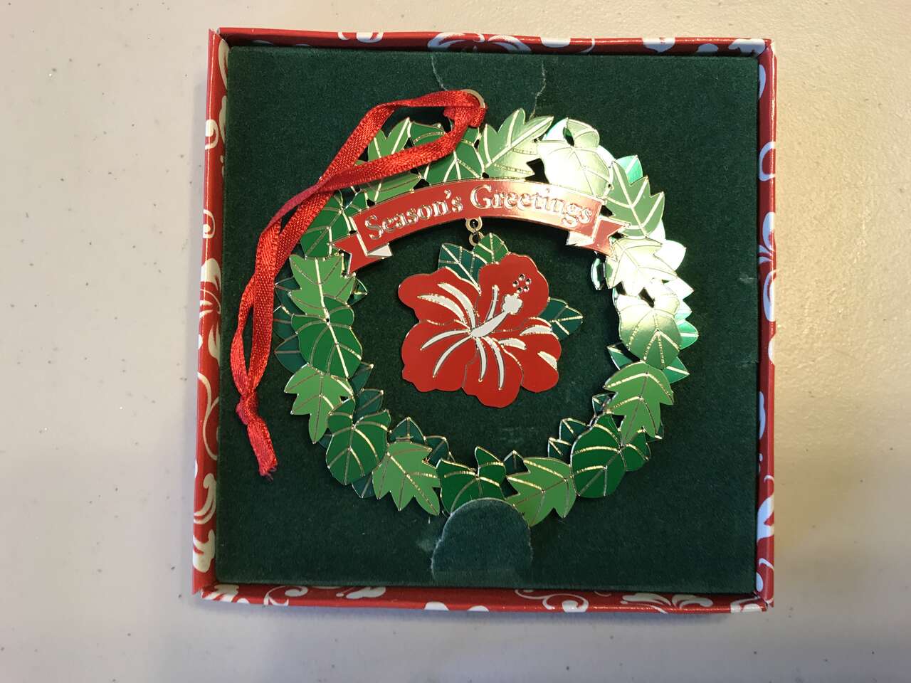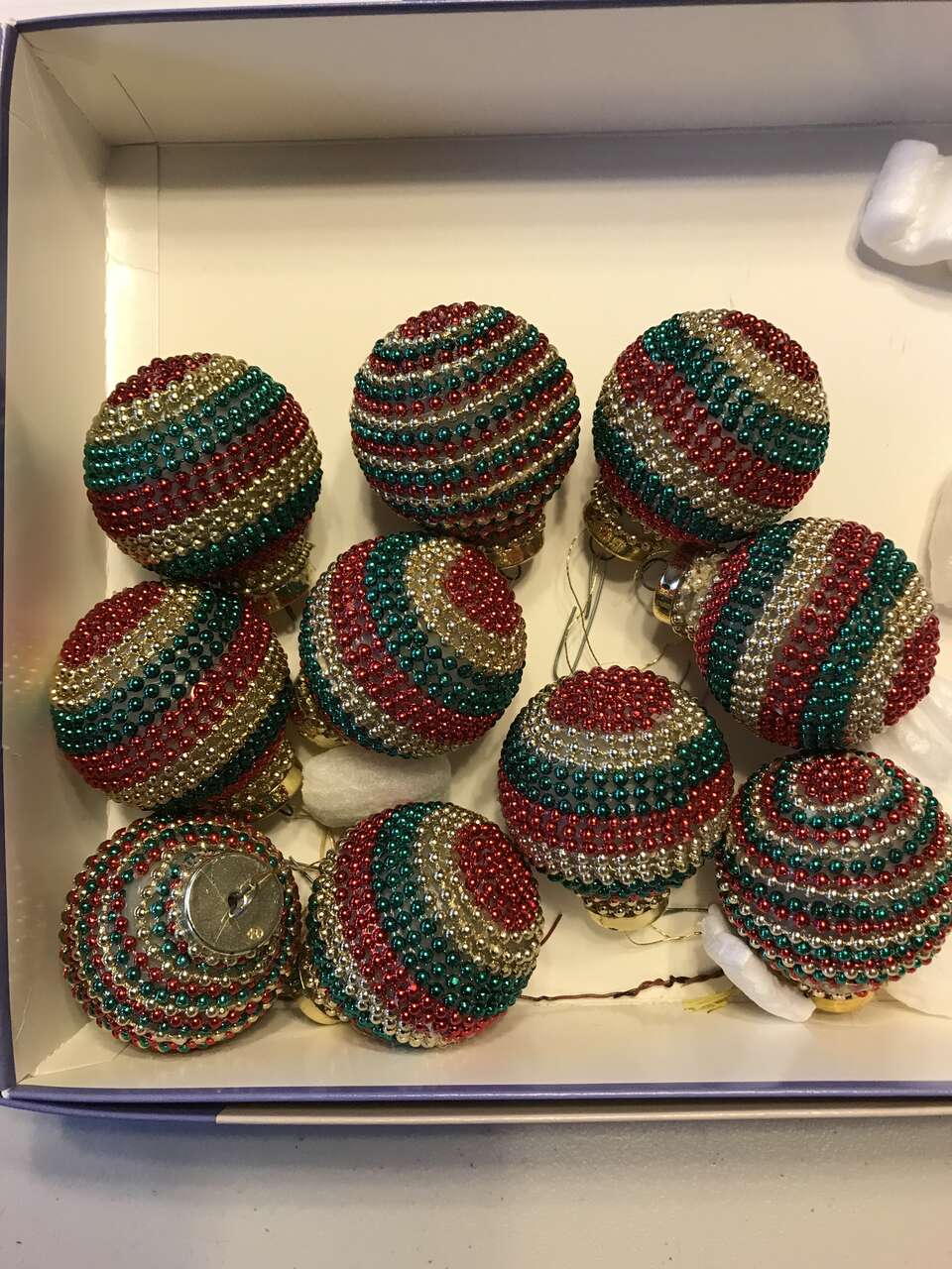 Red, Gold & Green String Beaded Wrapped Acrylic Ornaments, 10 available. 2 for $10.00