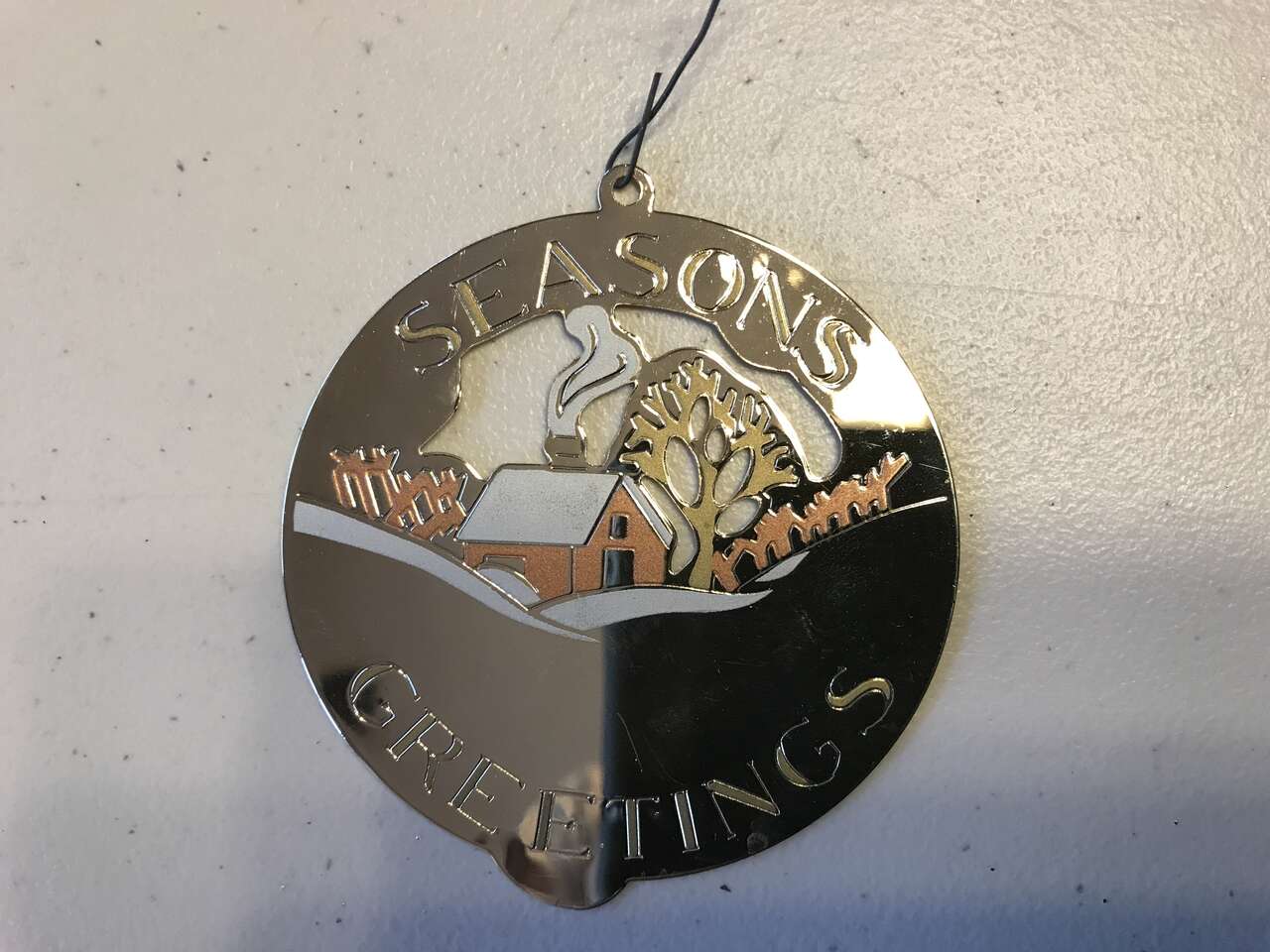 Seasons Greetings 3 Silver Tone Metal Reminisce Christmas Ornaments Collection set of 3 - 1.5". 3 for $10.00