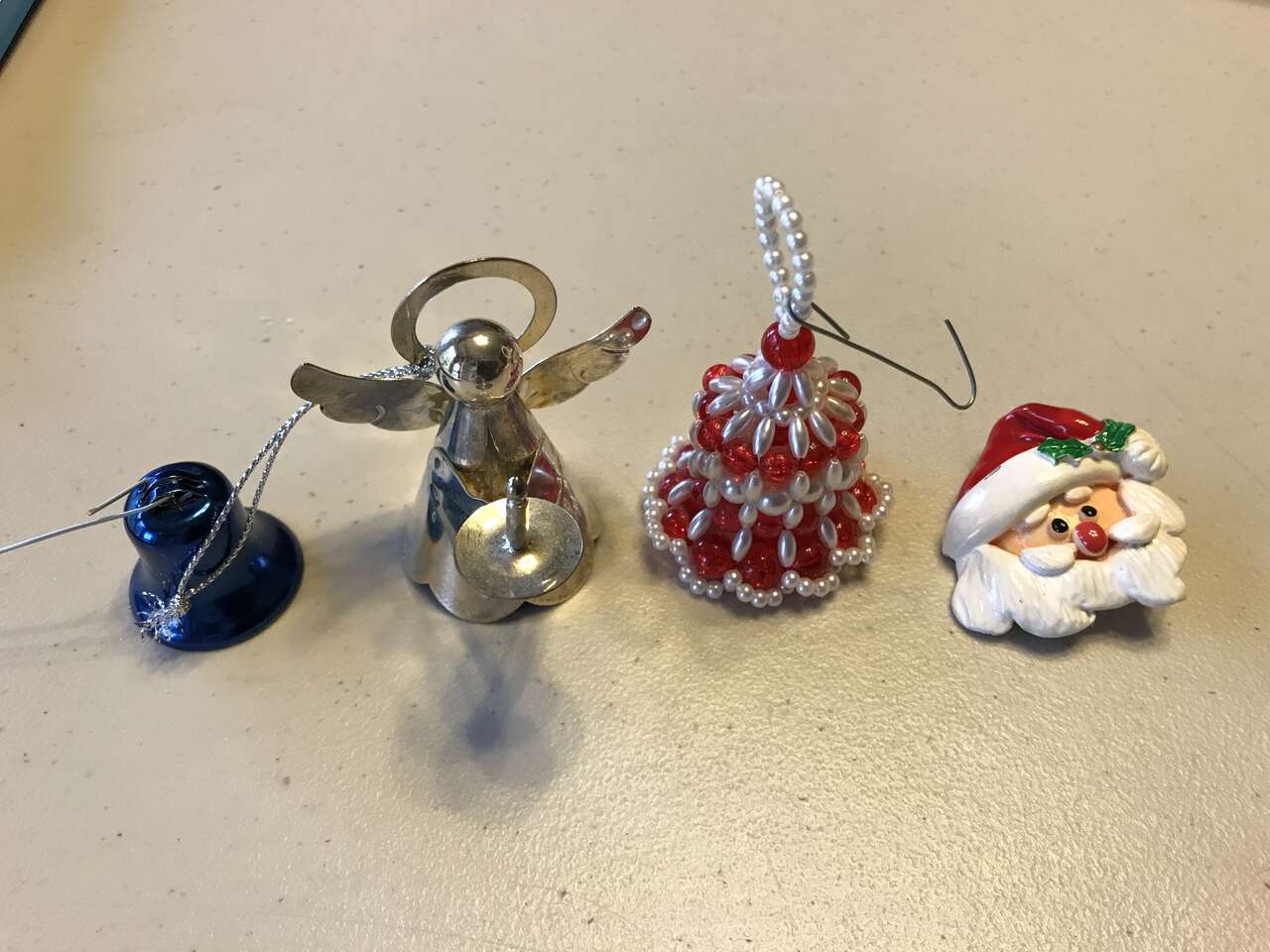Lot of 4 - Includes Silver Color Angel, Blue Bell, Red/White Beaded Bell, Santa Pin. 4 for $10.00